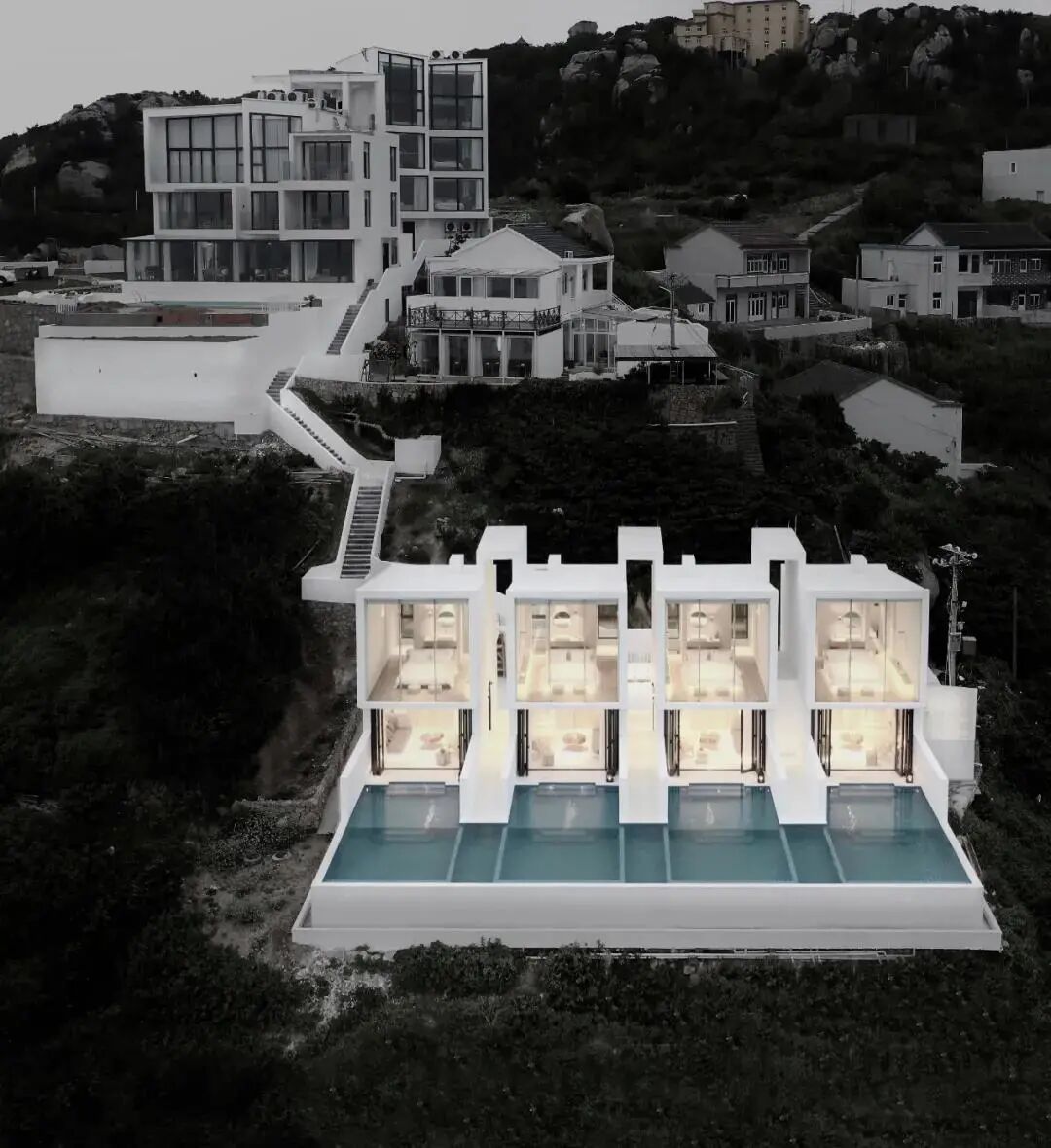 民宿地处中国东面一个叫枸杞的小岛上,蓝色的海域为这里提供了一个很好的天然景观,设计选用传统的混凝土框架做为基本结构体系,以应对岛上复杂的气候环境,在形式上以精简的白色壳体作为对场地的回应。