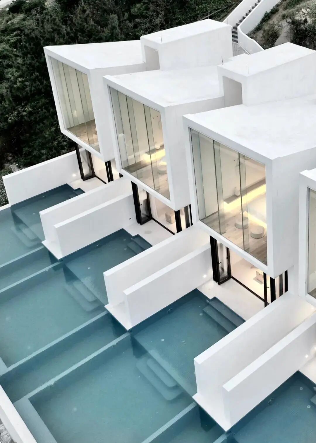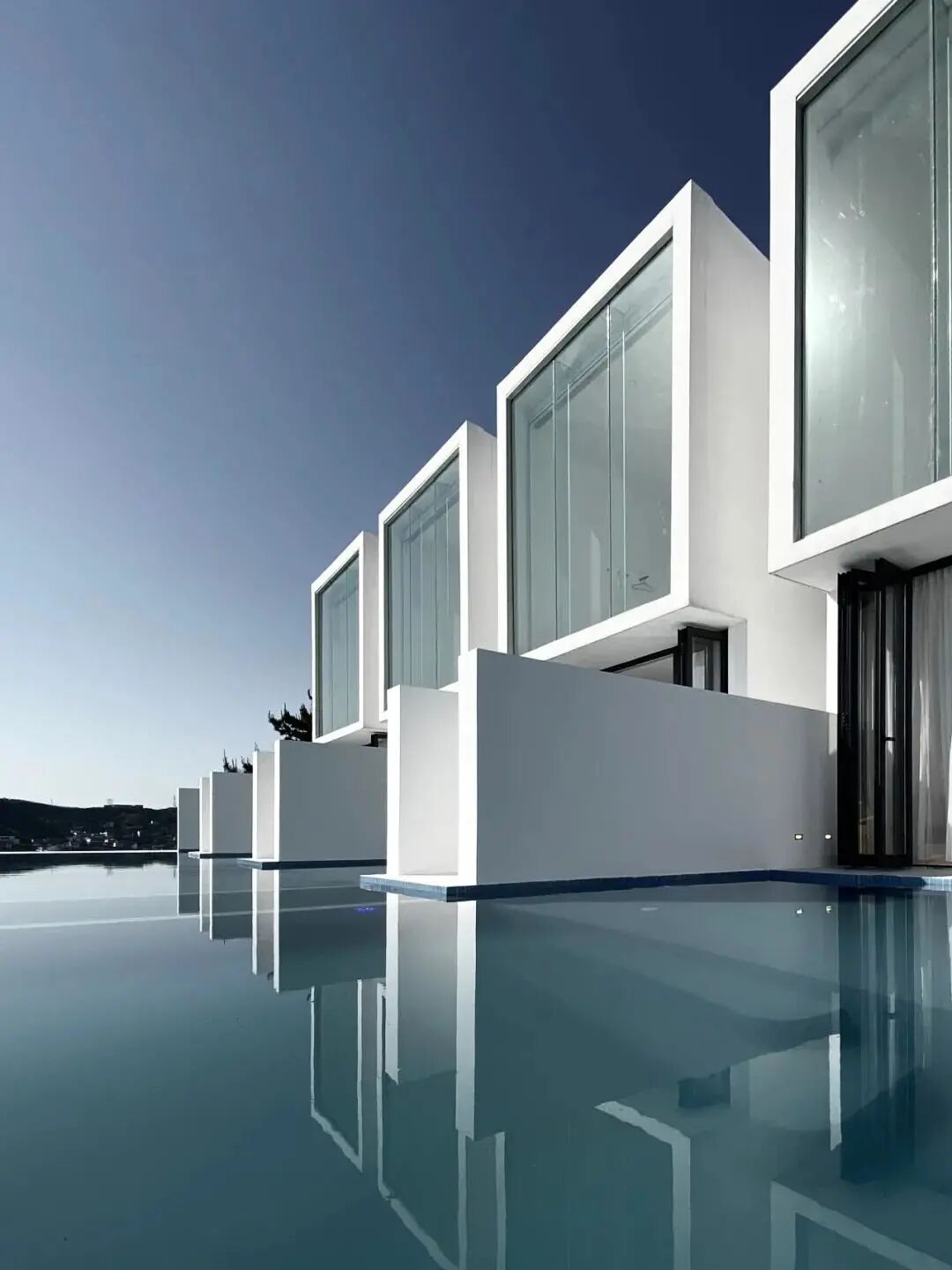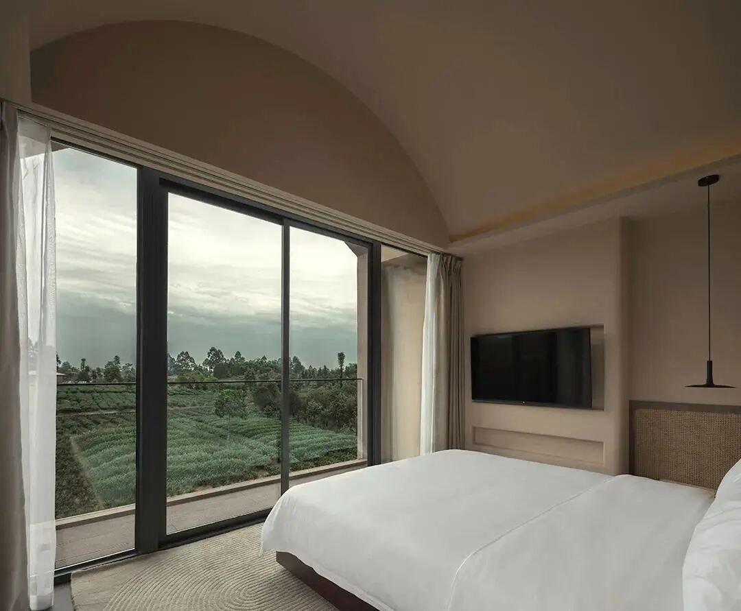 以白色回应当地的自然环境,不会给人太强的侵略感,空间上,选用白色和原木为主基调,在压制色彩后将视线引至户外风景。