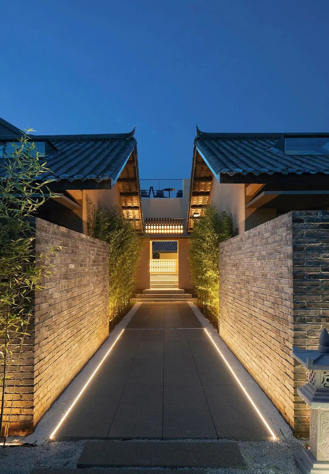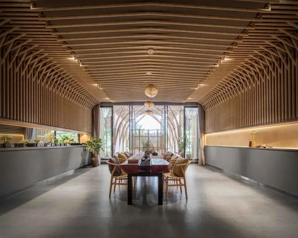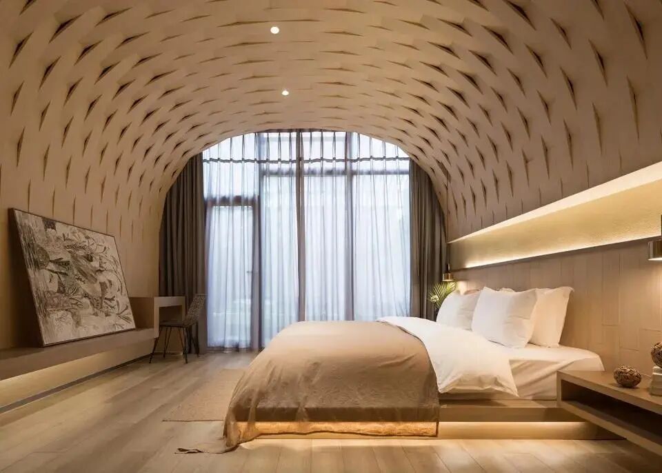 客房内部以竹条、竹片、竹皮三种不同的材料肌理,搭建成拱形的竹编,形成每个空间独一无二的表皮。过道顶面以原竹构筑,追求一种时空的“错乱大厅楼梯间以竹编造型,灯光将光影投射在墙上,像是竹海里被打碎的阳光。