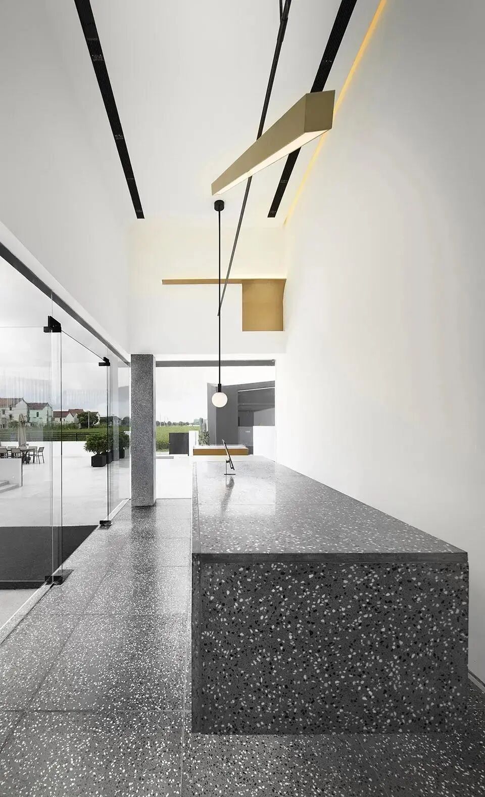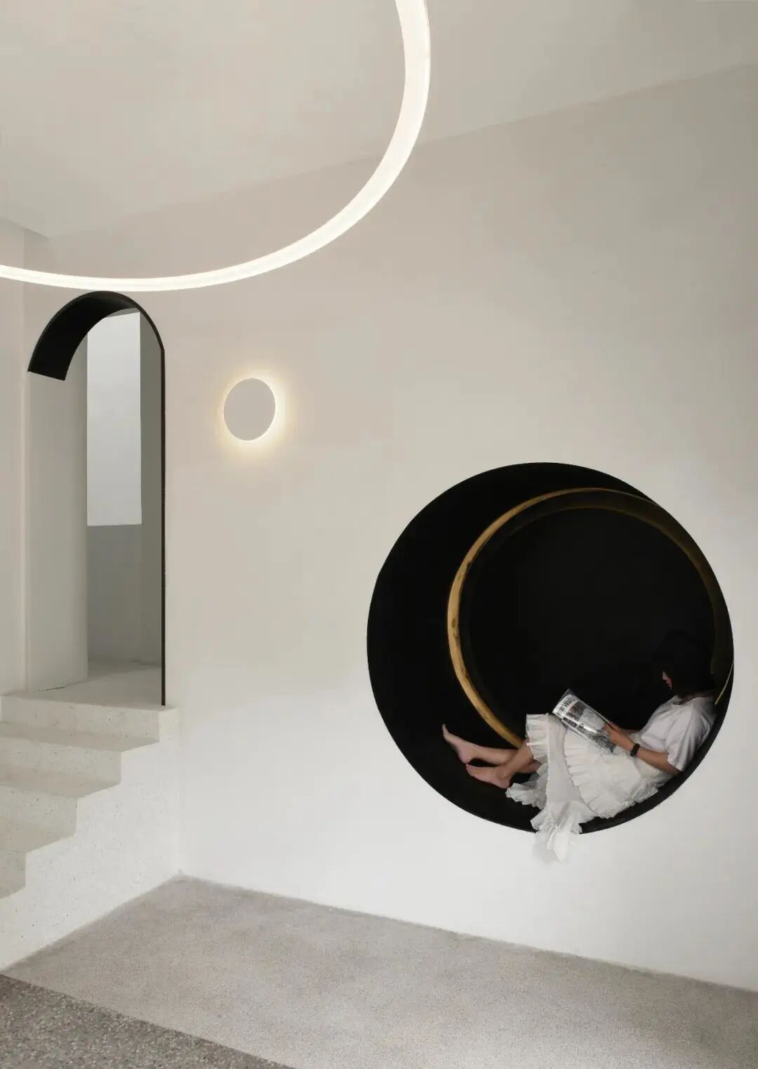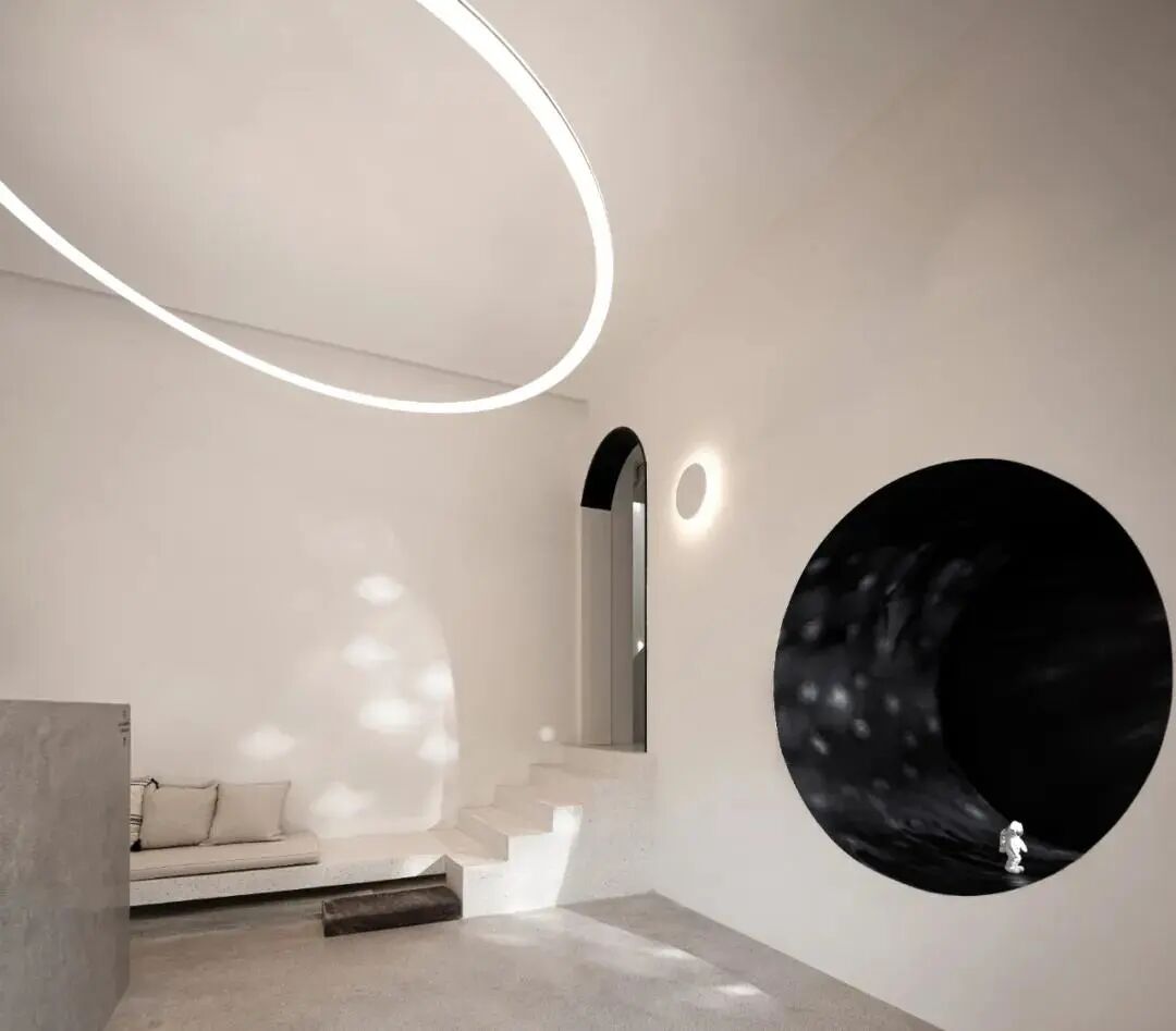 这所民宿的空间每一处都融入了星空元素。接待区以日食的天文现象为灵感,光圈状的吊灯来回应日环食的状态,镂空的圆形造型墙与拱形门让空间增加了立体感。