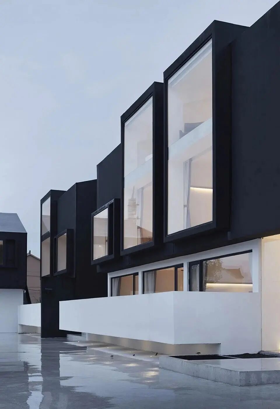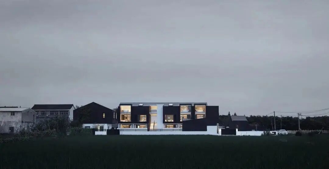 这座位于上海浦东川沙新镇的民宿中,设计师希望最终矗立在稻田尽头的不单单只是个民宿,而是带有某种精神性感知的建筑物。因此摒弃了传统民宿的固有概念,选用带有凝聚性力量的黑色作为建筑的主基调,极简的建筑形态与周边混乱的建筑肌理形成对立美学,以守望者的姿态出现在稻田尽头,打开一种全新的日常体验。