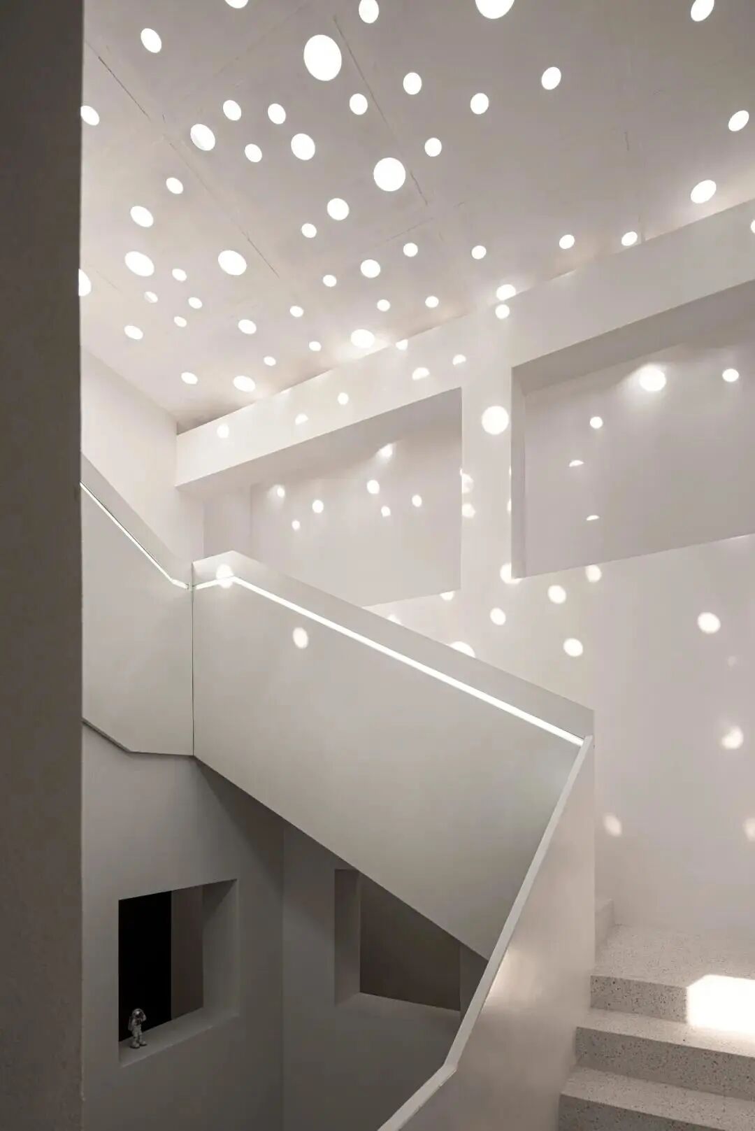 楼梯间的布光以北斗七星为灵感,光斑照耀到楼梯的每一个角落,星光点点,空间瞬间变得如梦似幻。