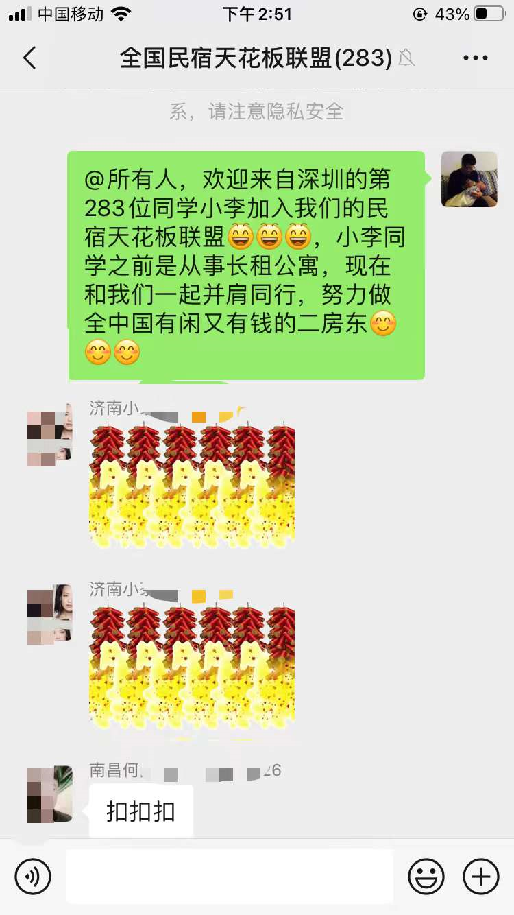 不管做什么项目,都需要向同行学习,同行就是最好的老师,借鉴他人的经验,会让你少走很多弯路,吸收别人的方法,也会让你找到更快的捷径。奶爸运营很多民宿社群,我们社群绝对是全国最有含金量的二手房东交流群,每天盖楼300+,全程没有废话,每天都是日租房技巧信息交流,在这种环境下,你想做不好都很难!一群牛批的人推着你进步!
