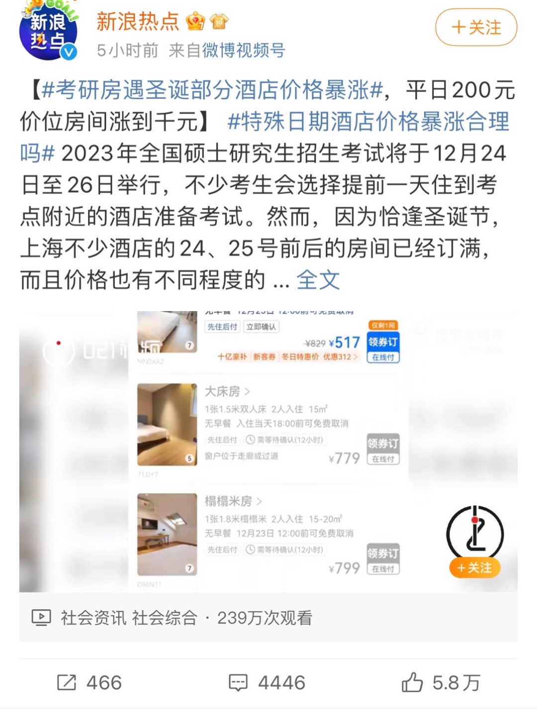 2023年全国硕士研究生招生考试将于2022年12月24日至26日举行,在得知具体考场后,大部分考生下一步就是预订考场附近民宿,各地民宿即将迎来百万级的预订高峰。