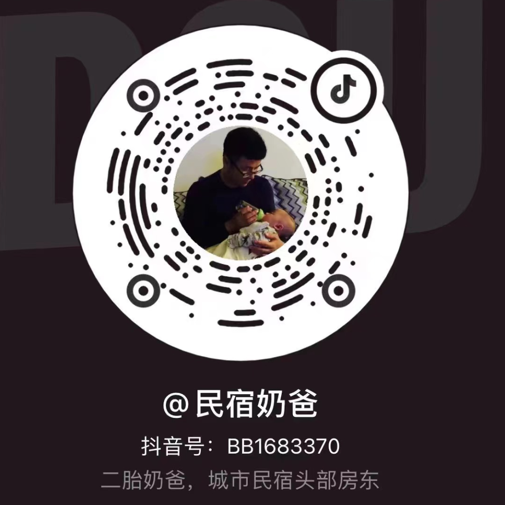 民宿奶爸,家里两娃,为了陪伴两宝成长,厌倦了朝九晚五的工作,和宝妈一起辞职出来做二房东创业,从0经验3万投资第一套日租房城市民宿,一年半发展到38套,目前在家创业也实现年入7位数!本意一切为了孩子不想再上班,但却意外实现了时间自由!这次我们没有把生活弄丢,做网约房二房东让我们一家四口幸福感满满,小伙伴想通过网约房创业做个轻松的二房东,不管是全职还是兼职,欢迎添加奶爸微信一起交流,知无不言言无不尽,微信号:BB1683370(或者扫码关注奶爸抖音号BB1683370)