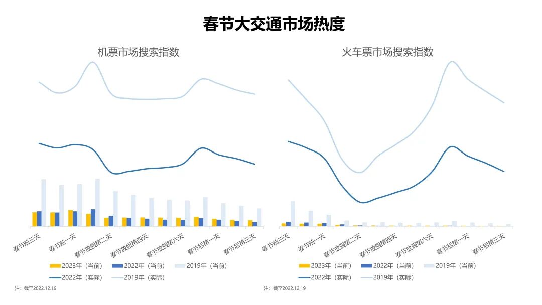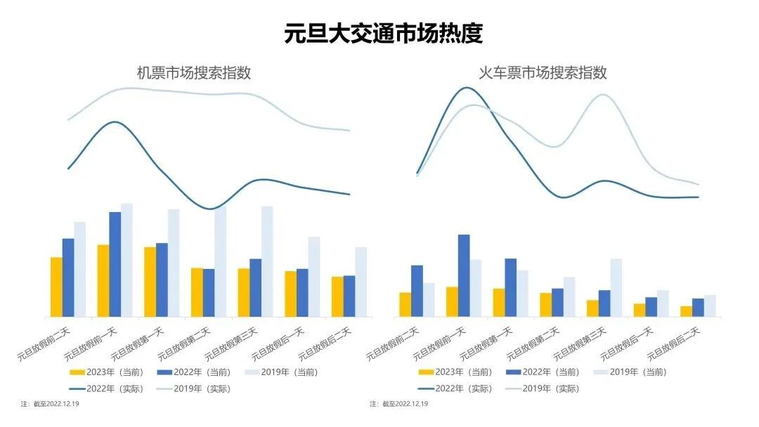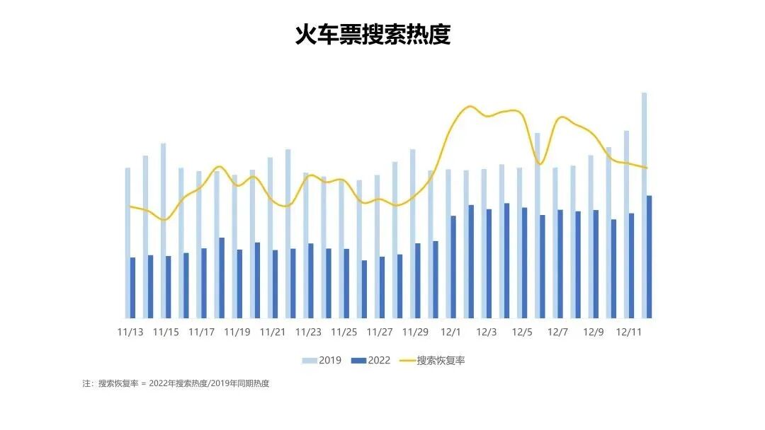 随着元旦及春节假期的不断临近,用户对这两个假期的关注热度持续上升。数据显示,12月7日-12月19日,关键词“春节”、“元旦”的搜索热度环比增长分别达210%和93%。从出行市场搜索热度来看,春运期间旅客出行热情尤其明显,截至2022年12月19日,2023年春节境内机票搜索热度已超过2022年同期水平,火车票搜索热度也恢复至2022年同期9成。