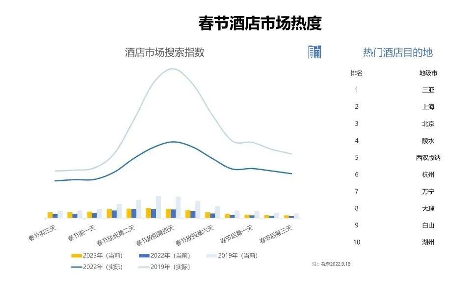 元旦市场热度也有所回升。截至2022年12月19 日,2023年元旦机票搜索热度恢复至2022年同期的85%;火车票搜索热度恢复至2022年同期5成,每日搜索热度恢复率在40%-80%之间浮动。尽管2023元旦出行市场热度较2022年仍存在差距,但相信随着元旦的不断临近及“防疫新十条”等政策的推动下,元旦出行市场搜索热度将会进一步提升。2023年元旦期间的境内酒店搜索热度基本与2022年同期持平,关注度排名靠前的酒店目的地包括三亚、上海、北京、杭州、南京、成都、广州、深圳、厦门、长沙。除此之外,陵水、延边、白山等城市的酒店搜索热度同比2022年、2019年同期均有显著提高。