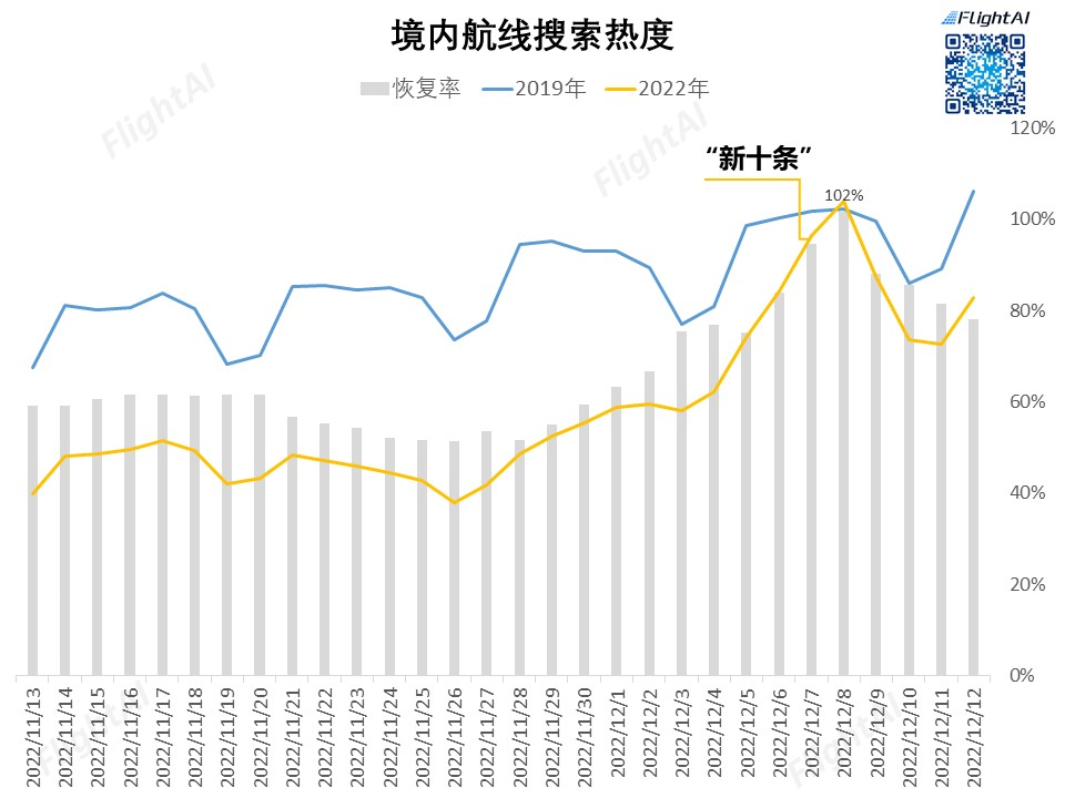 “防疫新十条”的发布以及“通信行程码”的取消,无疑使得疫情期间积压已久的出行需求得到进一步释放。据FlightAI数据,“防疫新十条”发布当天(12月7日)境内航线搜索热度环比前一周同期(11月30日)上升74%,第二天境内航线搜索热度达到峰值,2022年12月8日当天搜索热度同比2019年同期实现正增长;通信行程卡官方发布通知当天(12月12日),境内机票搜索量同比2019年同期恢复至80%。