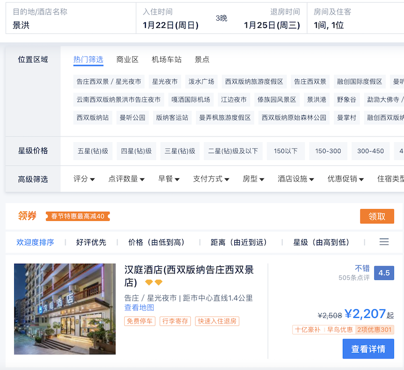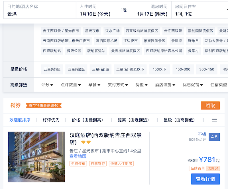 ,西双版纳的部分汉庭酒店目前价格已经达到了780多元一夜,而春节期间西双版纳部分汉庭酒店的价格高达2200多元一夜。