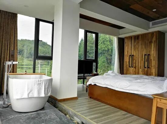 “寒舍迴塘”遵循人与自然和谐共生的设计理念,精心布局出10间山景房。老屋是一栋独立的楼房,高3层半,坐北朝南。重修时,我们将大部分墙面改成了玻璃的,让客人无论从哪个角度,都能享受明媚的阳光,欣赏绵延的山景。民宿顶楼的大房间有80平方米,能270度观赏周边风景,视野非常开阔。民宿的房间用“迴”命名,寄托了我们对客人再“回”来的希望。如今,已有许多客人成了回头客,每个房间都体验了个遍。
