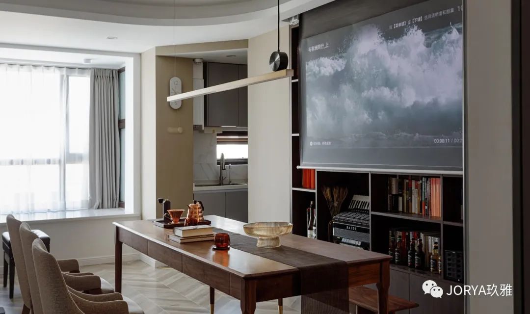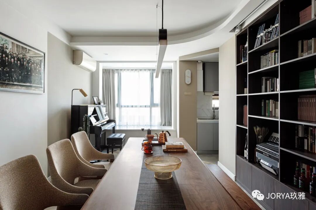▽下面这个案例中,客厅没有沙发和电视,取而代之的是钢琴、书籍和一个可以喝茶聊天的实木餐桌。同时还在吊顶内安装了投影幕,如果想看电影或电视剧可以投屏。