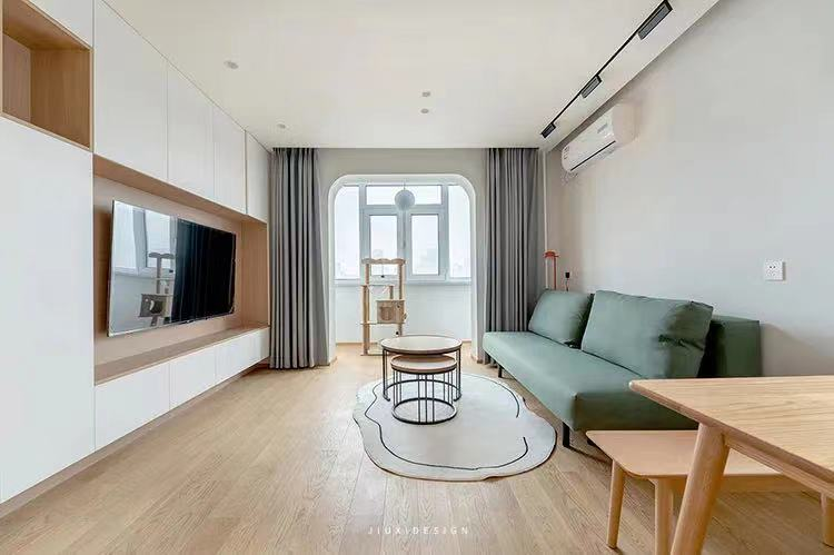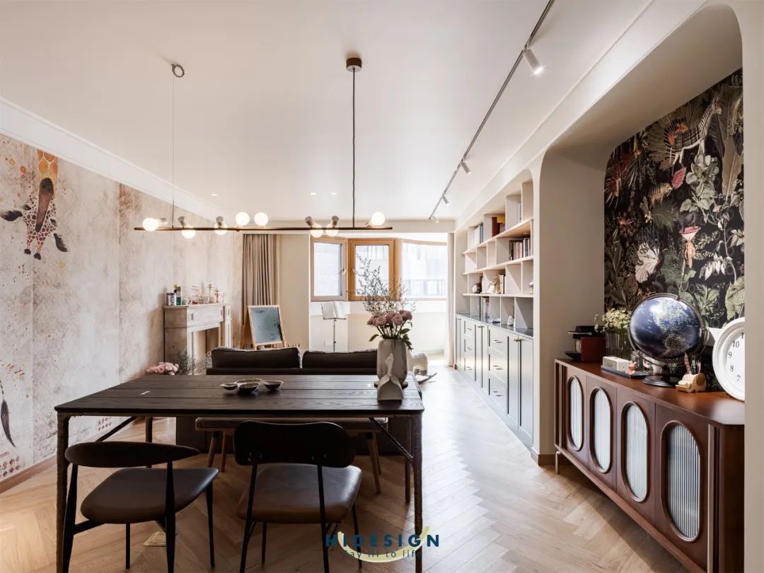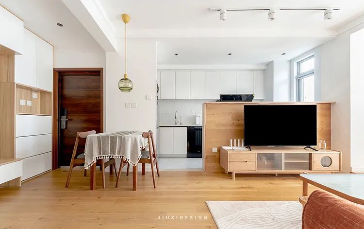 3.客厅功能叠加:新式客厅为空间补充“阅读写作区”和“一体化餐厨”。整个空间变得实用有宽敞,60㎡的房子能装出120㎡的气势。