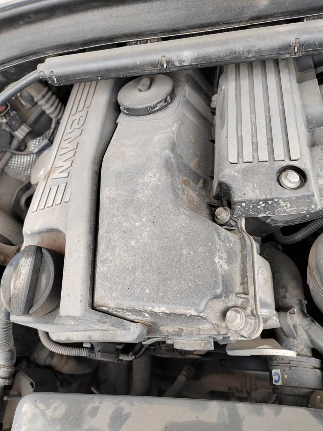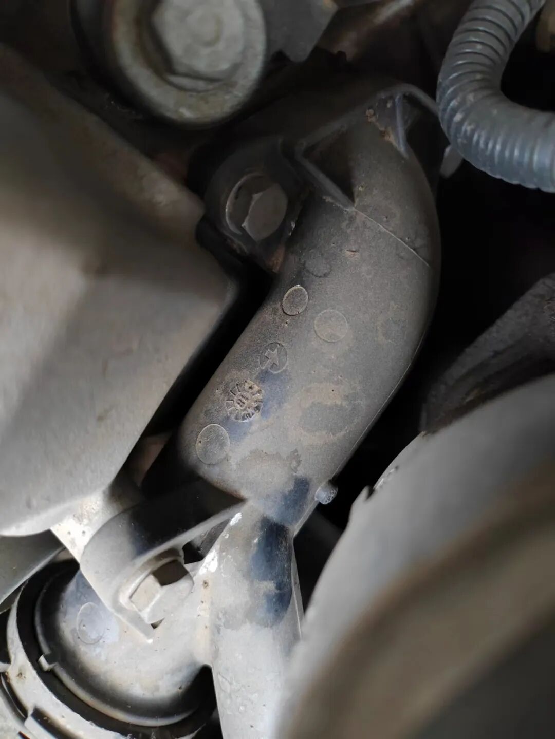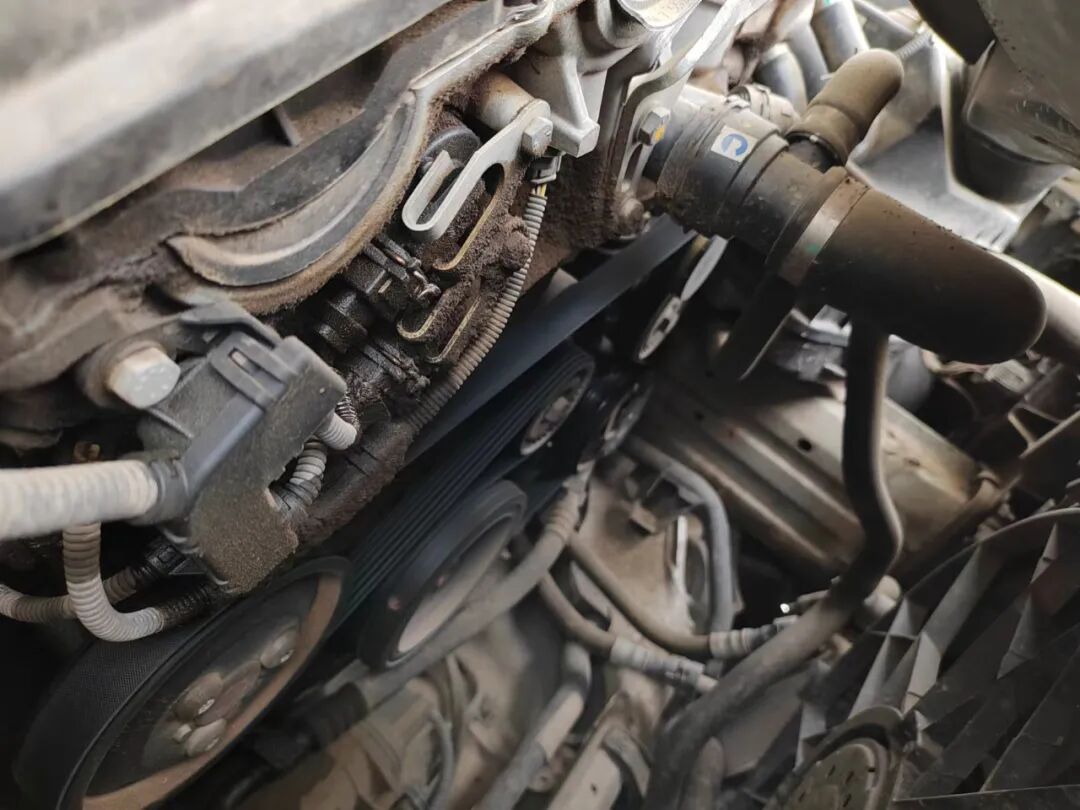 一眼可以看到,发动机舱内有些脏污和油迹,看来发动机有漏油的现象。仔细看了看机盖螺丝、龙门架螺丝、发动机基座螺丝,都没有动过。不过冷却液管路维修过,应该是水箱漏水或缺过水甚至说发动机高温过。另外发动机有轻微烧机油现象,这个也是德系车中常见的现象。发动机舱的整体情况再次证明,这车开的不够爱惜。