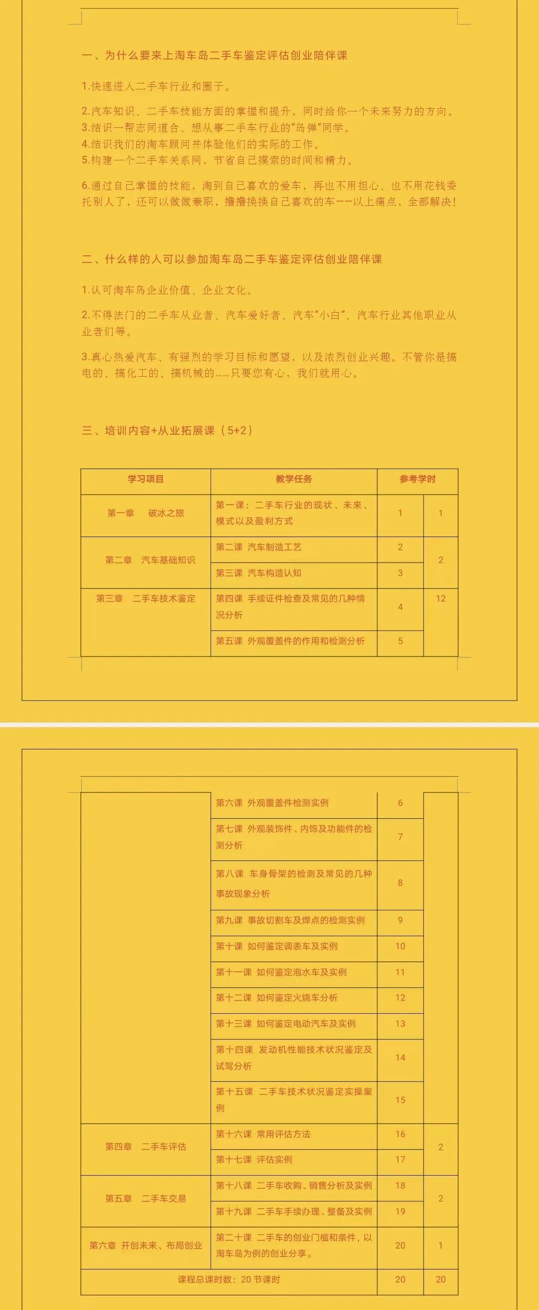 我们定了(线上)+(线下)的课程,线上一个月的时间,线下7天培训、实操+2天真实工作模拟(包括二手车市场淘车、检测、收车、卖车、过户上牌甚至物流发车、买保险等)。线上可以单独学习,为了对学员负责,线下不能单独学习,想参加线下培训必须先学习线上,把基础知识学好把自己的问题挖出来,带着问题来学习。
