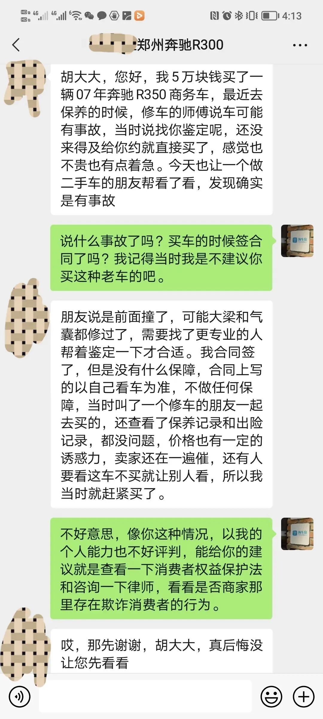 前段时间有位老客户找胡大大诉苦,说他在当地二手车市场买了一台二手奔驰R350,结果保养的时候发现竟是一台事故车,现在不知道该怎么办了。