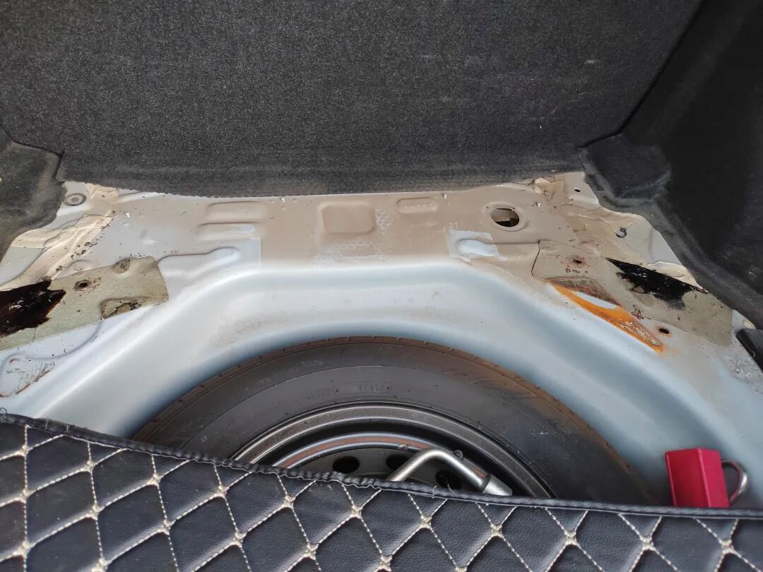 让胡大大先带大家看看这台车最容易识别油改气的两个地方。第一个就是主驾驶方向盘的左下侧有一个油气切换的开关,但是这个开关很多人会把它拆掉并用塑料修复,这个还存在。第二个是后备箱是否有对称的孔,既然油改气,后备箱一定要放一个天然气罐,为了安装牢固就必须得打孔。这个情况一般会有车商进行隔音棉掩盖或喷漆修复,但是底盘上一般还会有打孔留下的痕迹,很少有人去处理,所以检测车检测底盘很重要。
