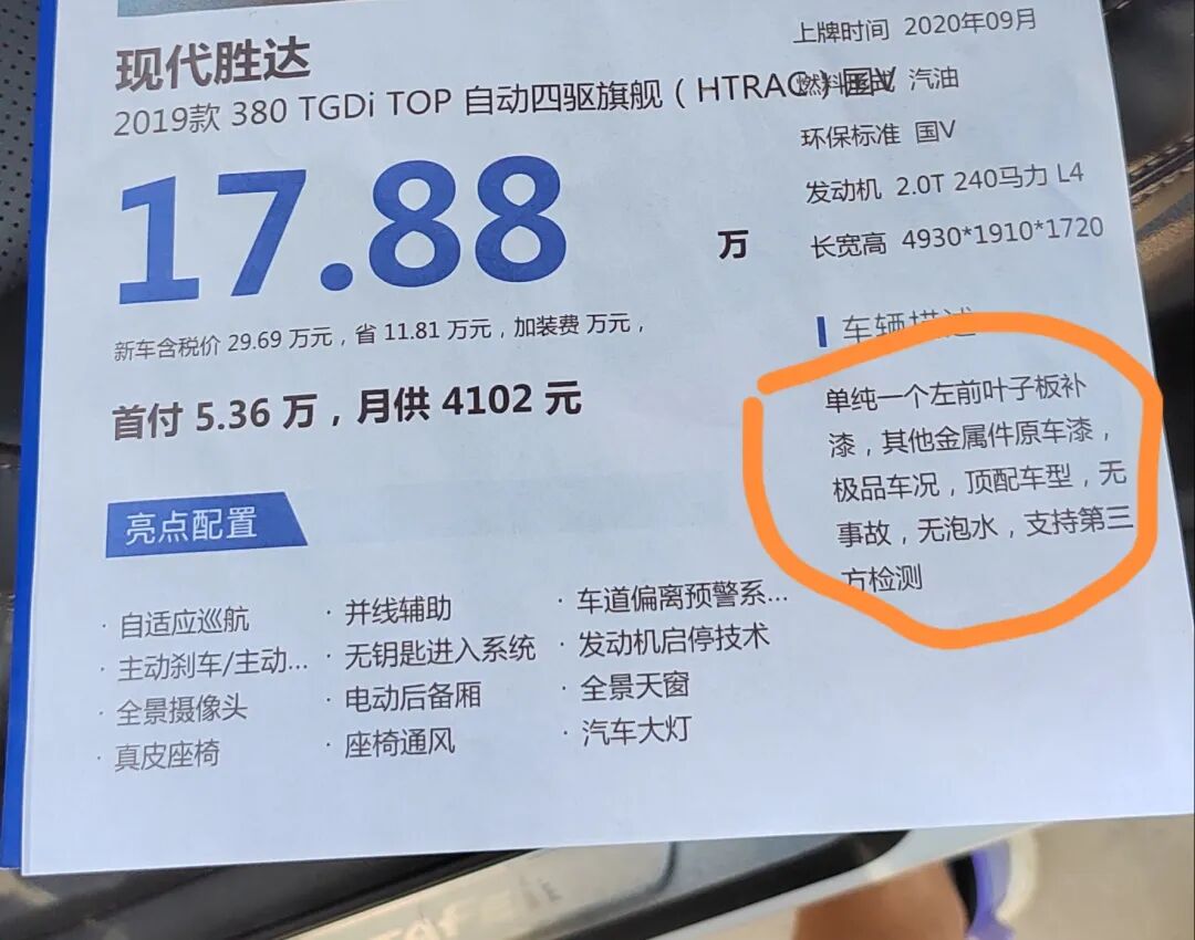 一位岛弹下淘车订单淘一台高配的现代新胜达,这个车源不多,车况好价格合适的,更需要点缘分了。我们还没有为其淘到合适的,自己经朋友介绍淘到一台性价比不错的现代胜达,2020年上牌,380 TGDI TOP 自动四驱旗舰版,5万公里,全程记录,价格16.8万。