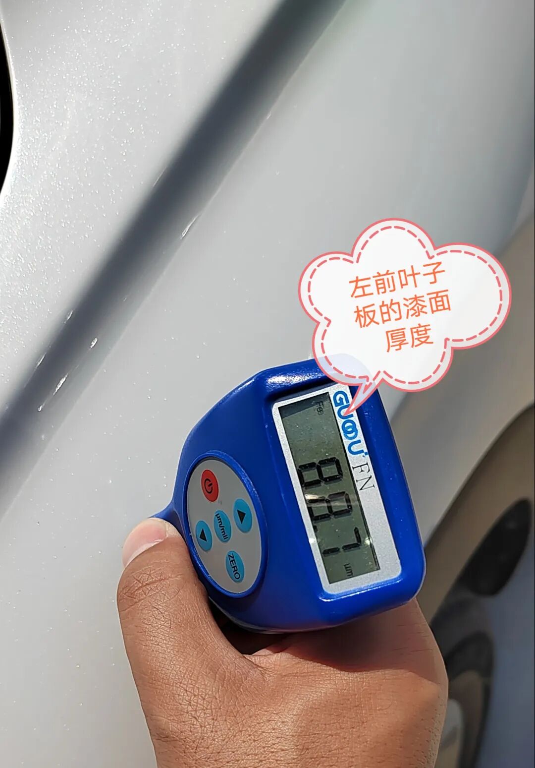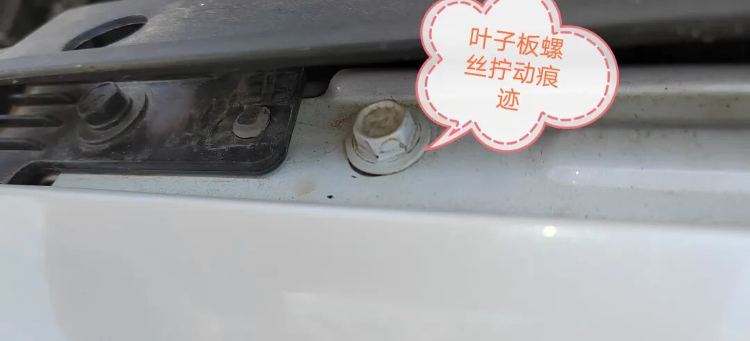 检查到左前叶子板时,发现左前叶子板用漆面测厚仪检测的漆面厚度在90微米左右,和其他没有补漆的漆面厚度很相近,但是叶子板螺丝有拧动拆装的痕迹能看出来,处理的不好。