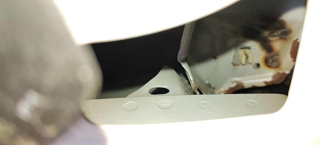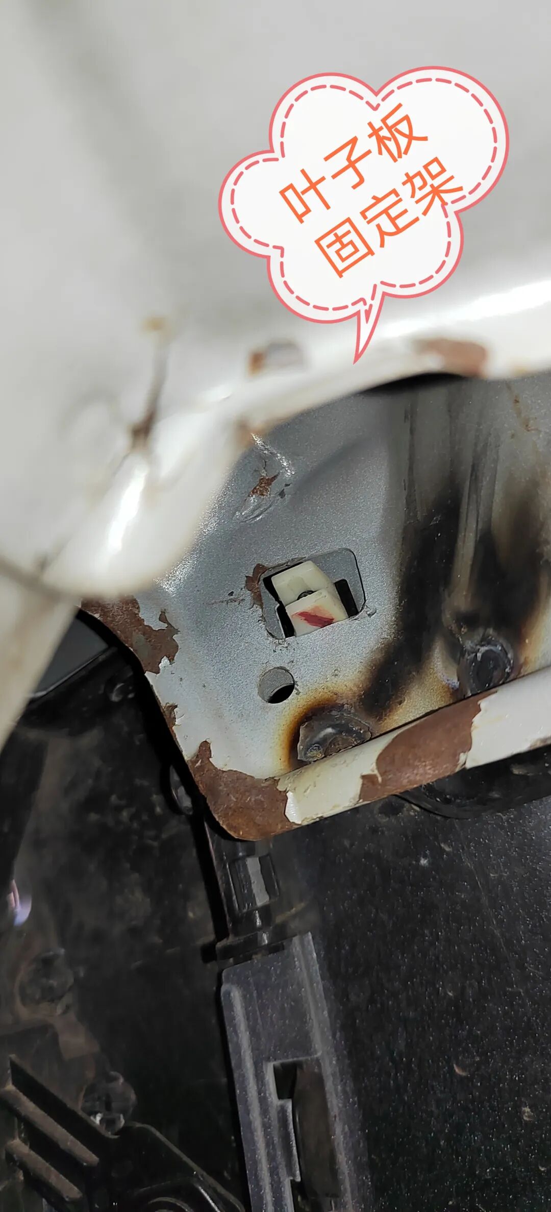 但是左前叶子板内侧的叶子板内骨架有变形的现象,拿着手电筒再顺着往里往下看,看到左前叶子板固定架严重变形,且有烧焊的现象,因为这个叶子板固定架和叶子板内骨架是焊接在一起的,不能单独更换,所以4S店进行了校正和焊接修复,但是这个修复工艺真是不敢恭维。