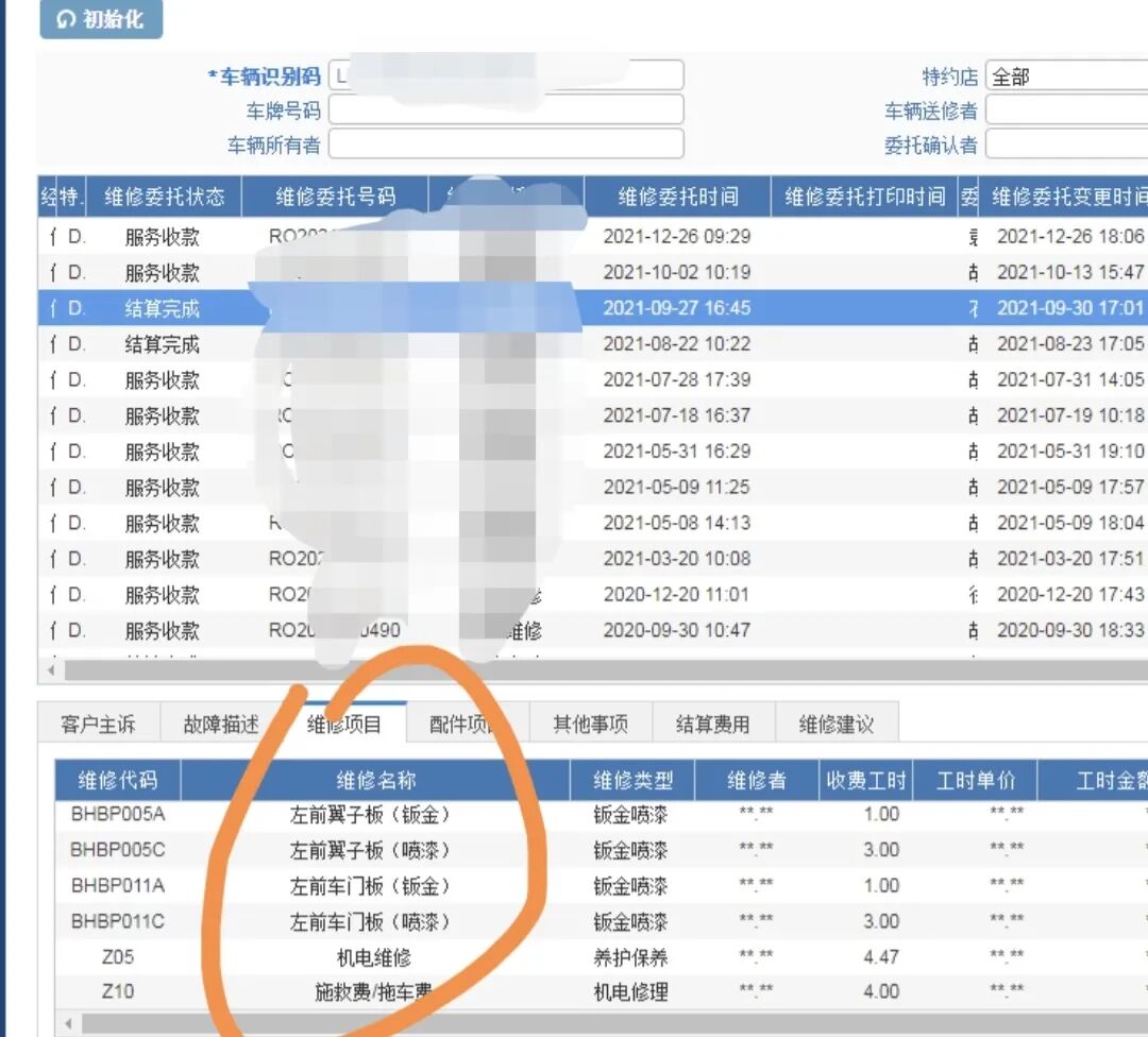 同时从这个受力修复的情况,还可以推断这台车的左前事故受力有点大,应该左前大灯、保险杠、甚至是左前轮胎、轮毂都可能更换了。但是保养记录上只有左前叶子板和左前门的钣金喷漆记录。