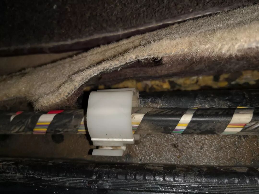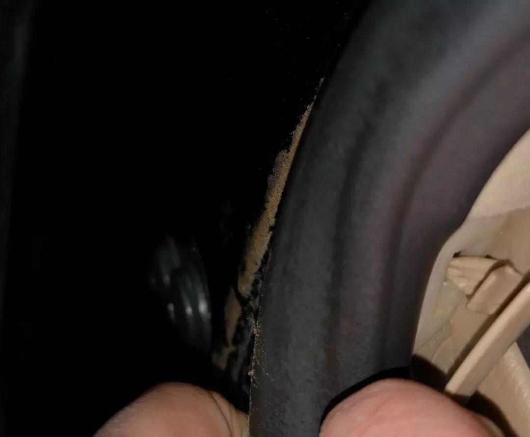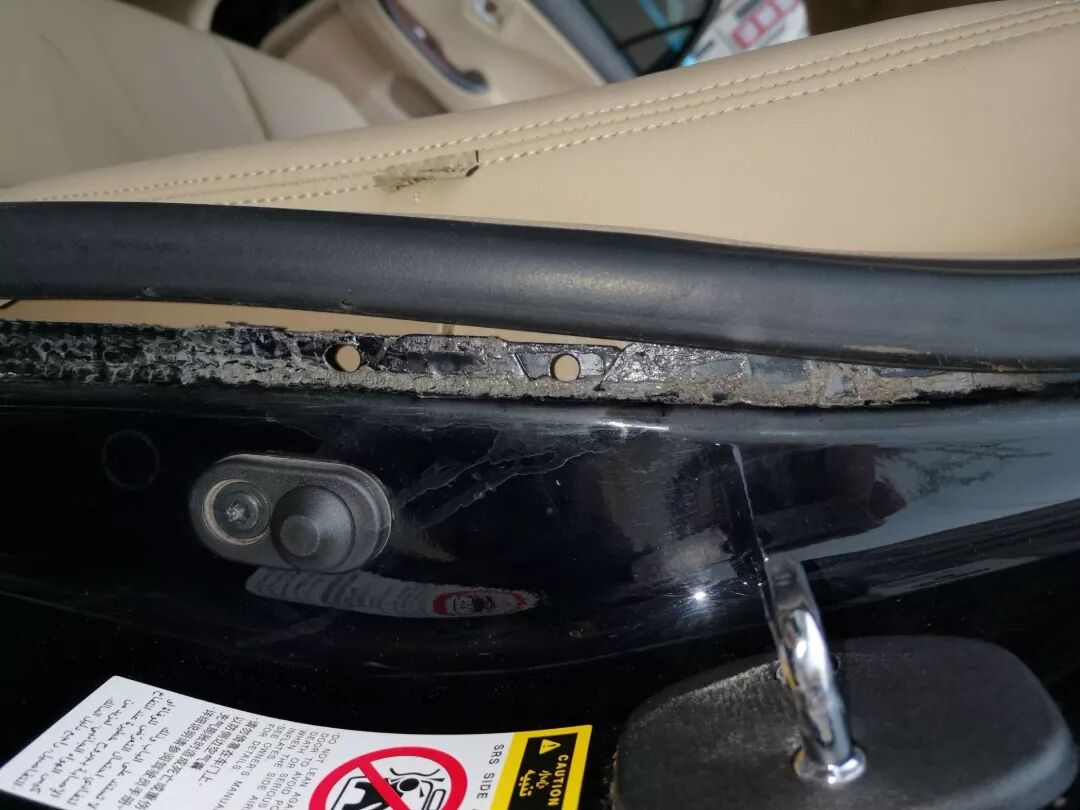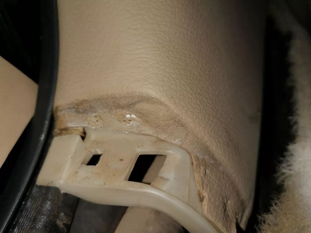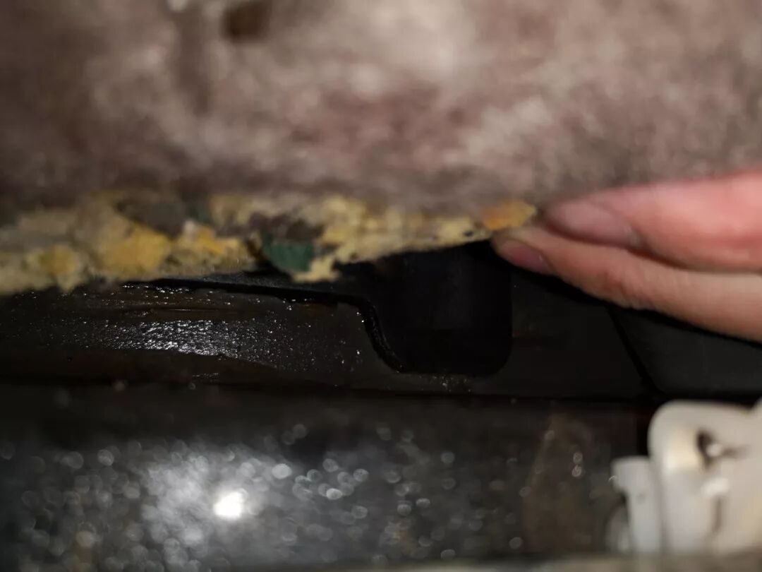 带着上面的这些判断,开始扒开车门框表面的覆盖板,触摸和查看车的地板胶、隔音棉和底板等,发现地板胶很潮湿,隔音棉有腐烂的痕迹,底板也有水渍。接着我把其他四个驾驶座下面和后备箱内都进行了查看,才确认此车为泡水车。