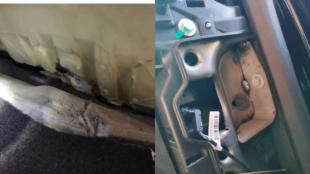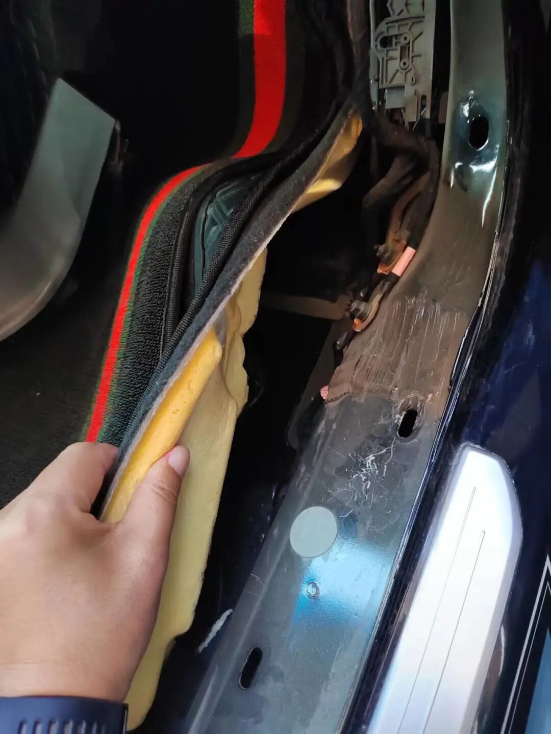检查座椅滑轨的时候确实都有被拧动拆装和锈迹,不免会让人怀疑进水了。但是我们不能仅仅凭借这些就下结论,这样就是对自己和岛弹太不负责任了。胡大大把门槛饰板都拿掉查看四个门槛线束和车内地毯和地板下的隔音棉,没有发现进水的痕迹,电子电器也正常使用,比较灵活没有反应迟钝和花屏的现象。