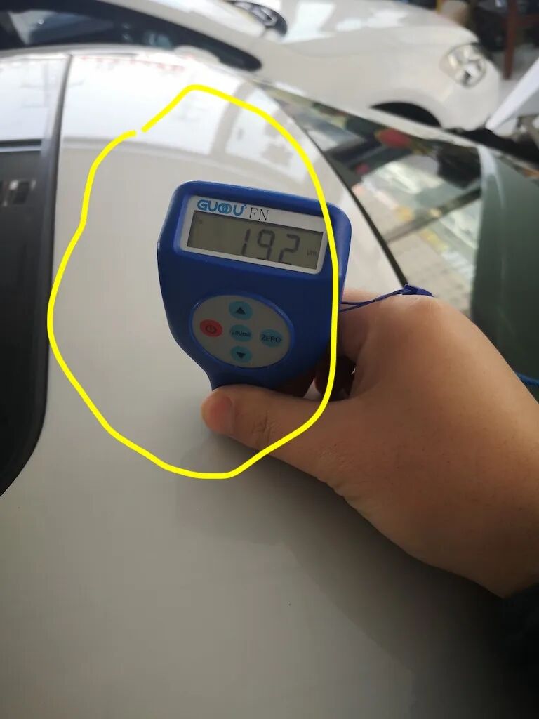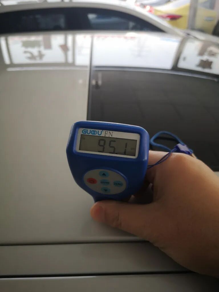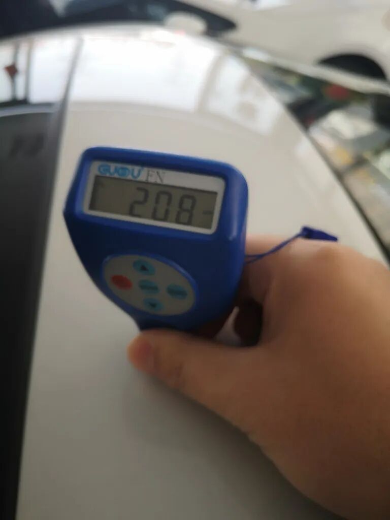 检测完,发现除了保险杠有补漆(塑料保险杠只能靠经验判断是否喷漆,漆面测厚仪就参考不了了),钣金的地方竟然在车顶,不过还好,就一小块且撞击的力度也不大,应该只是补了薄薄的一层腻子(正常这台车的原厂漆面厚度在100μm左右,那个钣金补漆的地方有200μm左右,也就说比原厂漆厚了0.1毫米),完全不影响使用安全,经我们推测应该是高空坠物所致。
