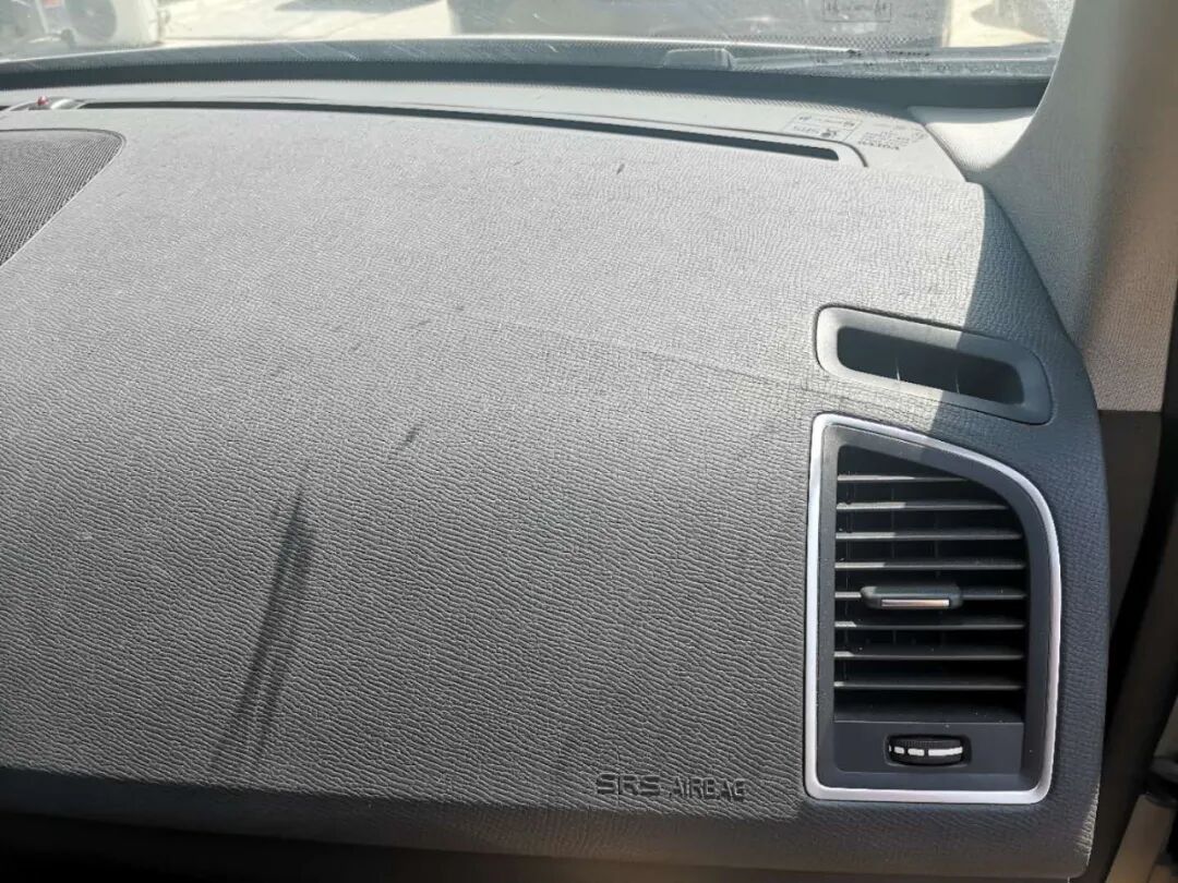带着疑问,查看方向盘中控台安全气囊部位情况,仔细观察发现副驾驶气囊盖板有一明显细长凸起痕迹,而且带有不规则折皱,基本可以判断安全气囊弹开过。众所周知,通常情况下安全气囊需要一定撞击条件下才能弹开,而此车四梁六柱均完好无损,莫非托底了,曾经就遇到过有些中高端车型托底或高速过坑洼路面时安全气囊弹开情况,更近些的是前段时间检测的一辆路虎行者2代,主驾驶膝部气囊因电子元件稳定性不好自己弹开了(也可能是越野的时候震荡太厉害导致的),经反复检测并未有事故修复现象,气囊盖板直接用胶带粘合的。