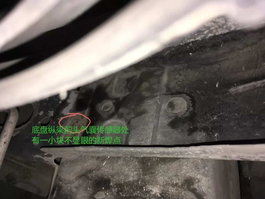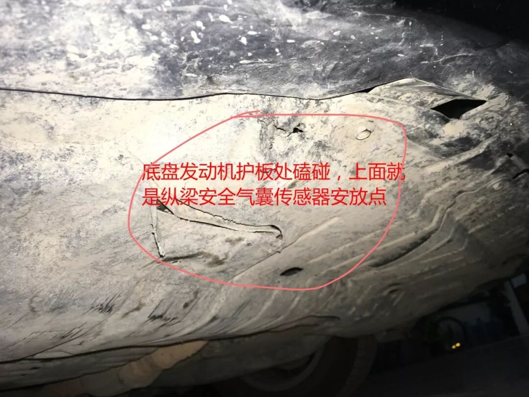 最后从底盘查原因,但是底盘发动机变速箱处被发动机护板挡住了,不过我们还是发现了端倪,发现发动机护板烂了一块,而且烂的那一块的附近就是安全气囊的传感器的安装点并发现了有不明显的从新焊接的一小块焊点,从这些现象我们就可以判断是因为底盘刚好且巧合的磕碰到了这个点并达到了一定的力度,安全气囊启用了,其他地方并没有伤到。
