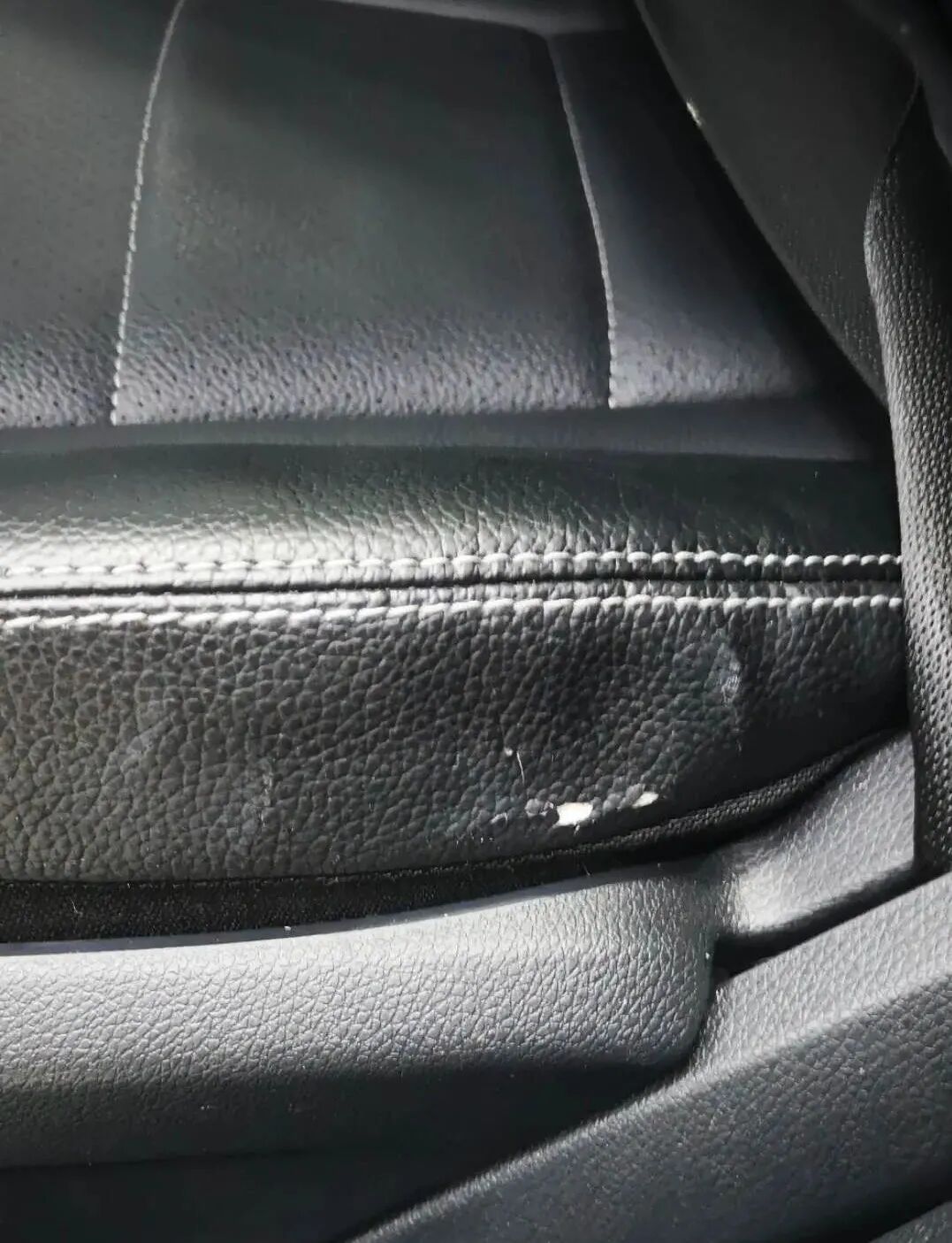 车在一家汽车展厅里放着,外观看上去还挺光鲜的,第一印象还不错。检测一圈下来,发现有一圈钣金补漆,几处划痕、瑕疵。对于这个年份的车要求也不能太高,好在没有大的撞击痕迹,可以排除大事故了。但是来的时候卖家给客户说的是补漆很少。