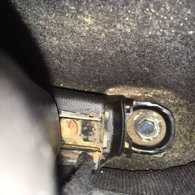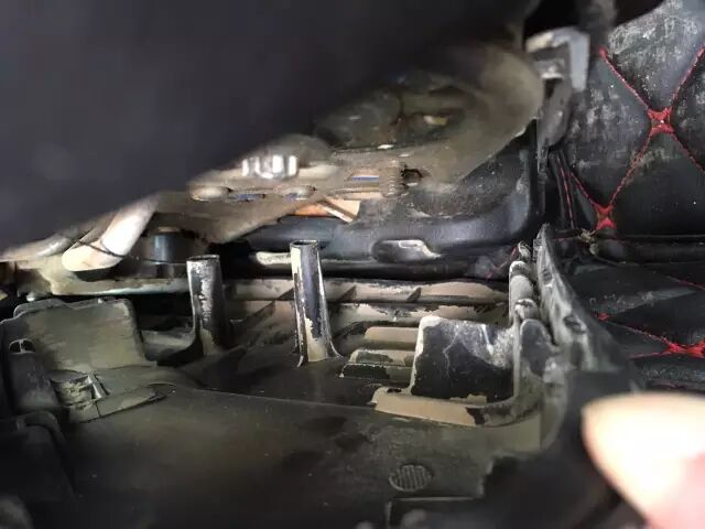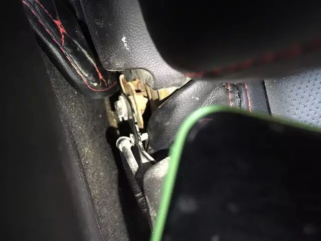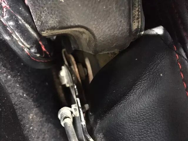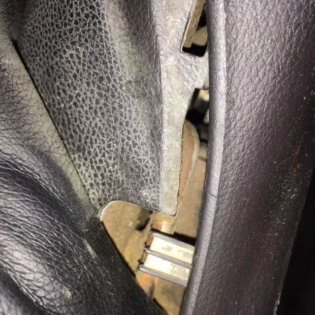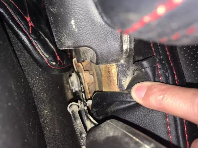 然后我查看座椅下面的滑轨固定螺丝,发现正常,没有生锈痕迹但有拧动痕迹(难道是为了伪装换了螺丝?),接下来我扒开崭新的座椅真皮,发现座椅调节器和滑轨处出现了明显的生锈痕迹。