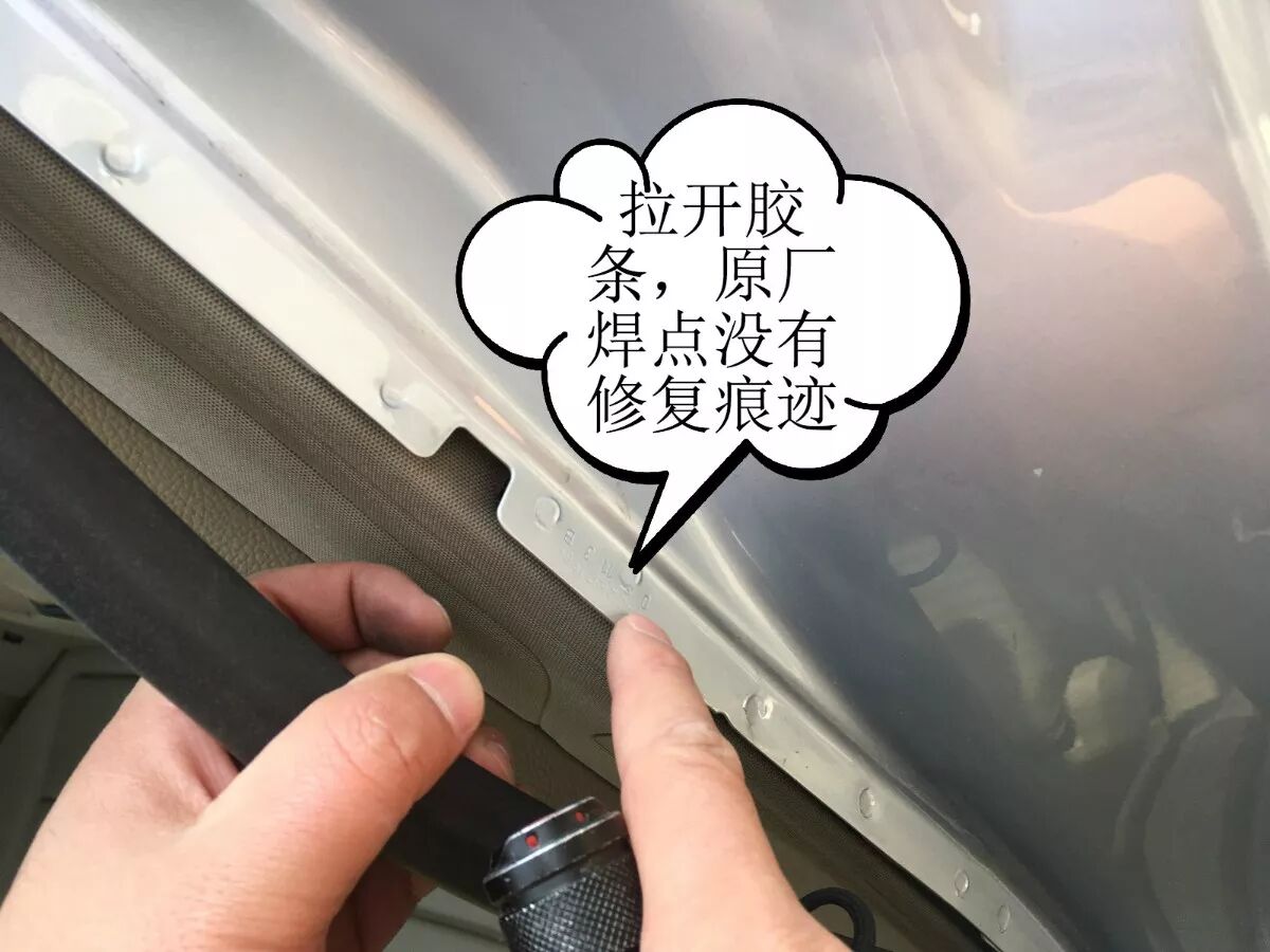 一:奔驰E200L,右前撞击,力度不是很大,伤到了翼子板,翼子板直接换了,左前A柱下端轻微变形,检测有一块拳头大小的地方钣金喷漆,内侧没有钣金、切割、焊接的现象,拉开车门框胶条,原厂焊点正常。这种情况虽然是A柱有了修复现象,但远远达不到重大事故车的级别。对车身安全性的影响几乎可以忽略,更算不上重大事故车,驾驶起来也很正常。