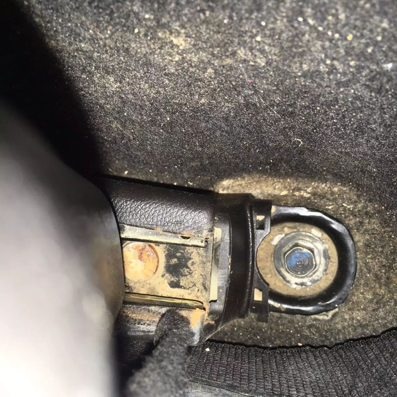 然后我查看座椅下面的滑轨固定螺丝,发现正常,没有生锈痕迹但有拧动痕迹(难道是为了伪装换了螺丝?),接下来我扒开崭新的座椅真皮,发现座椅调节器和滑轨处出现了明显的生锈痕迹。