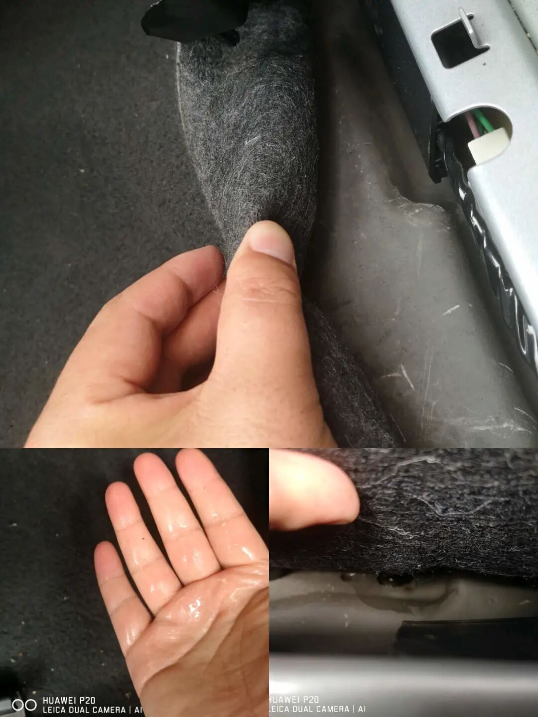 接着检查电子仪器,发动机有故障灯。检查座椅滑轨没有问题,但是胡大大习惯性用手触摸地板胶的时候,发现很潮湿,胡大大就把门槛盖板揭开了,发现有很多水珠,继续检查另一边和后面的地板,发现这车地板进水了。