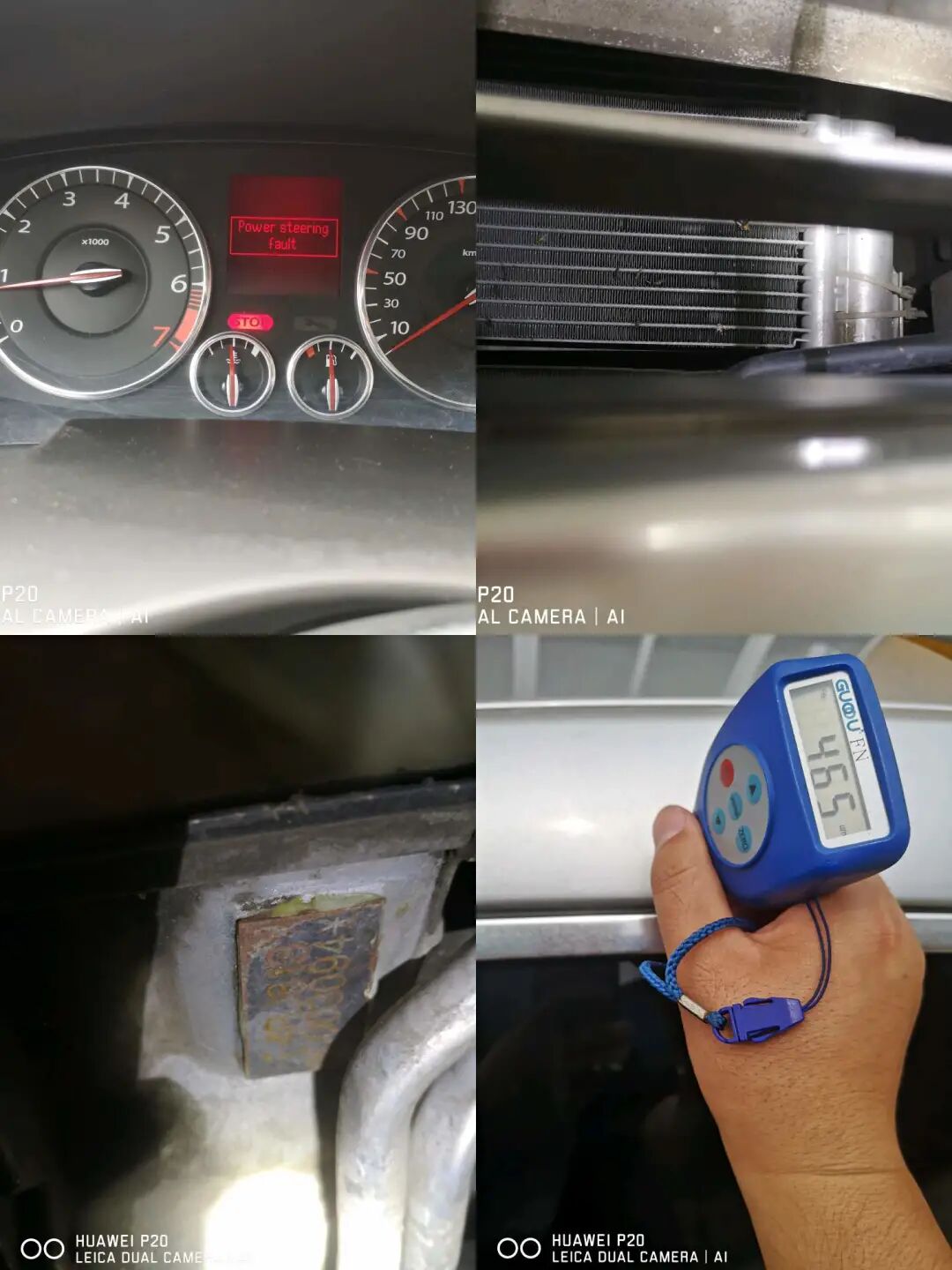 接着检测车身骨架:发现前面被撞过,前防撞钢梁弯曲、纵梁和缓冲块的链接螺丝有拧动痕迹。最有意思的是前面的冷凝器检查的时候发现是用绳子绑在前面框架上的,车主说买不到合适的零部件,就配了一个差不多的装上了,因为不能组装到位,就只能绑上去了。AB柱上有500微米左右的钣金现象。