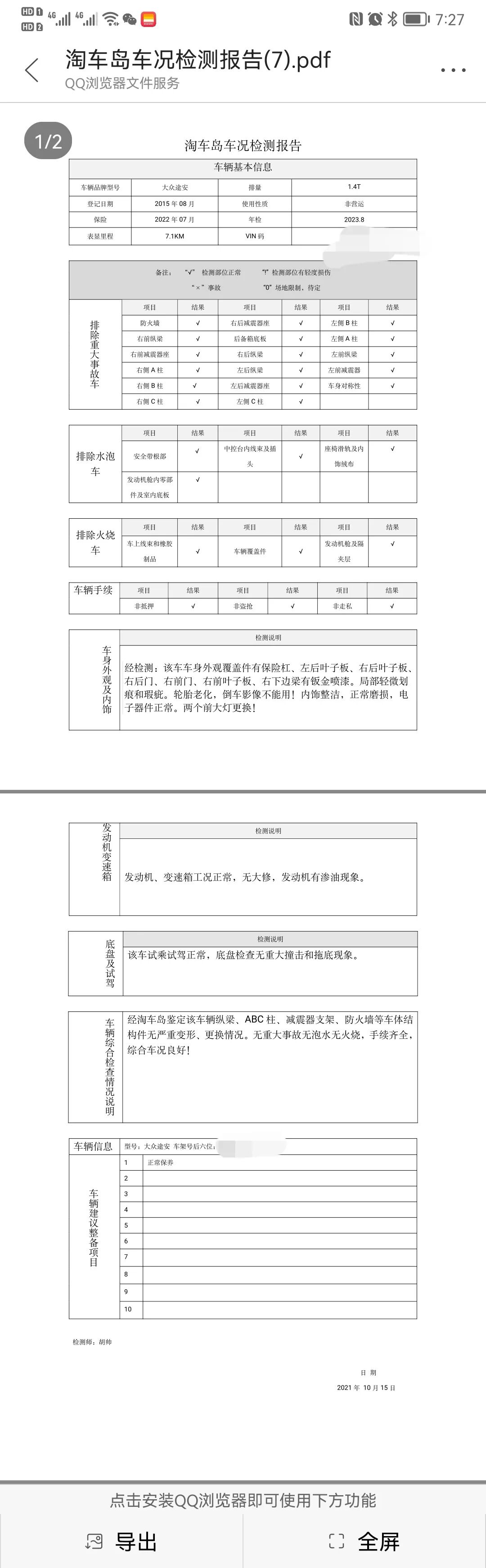 结果还好,除了发动机有轻微渗油现象,其他都没问题,也没有大修迹象。