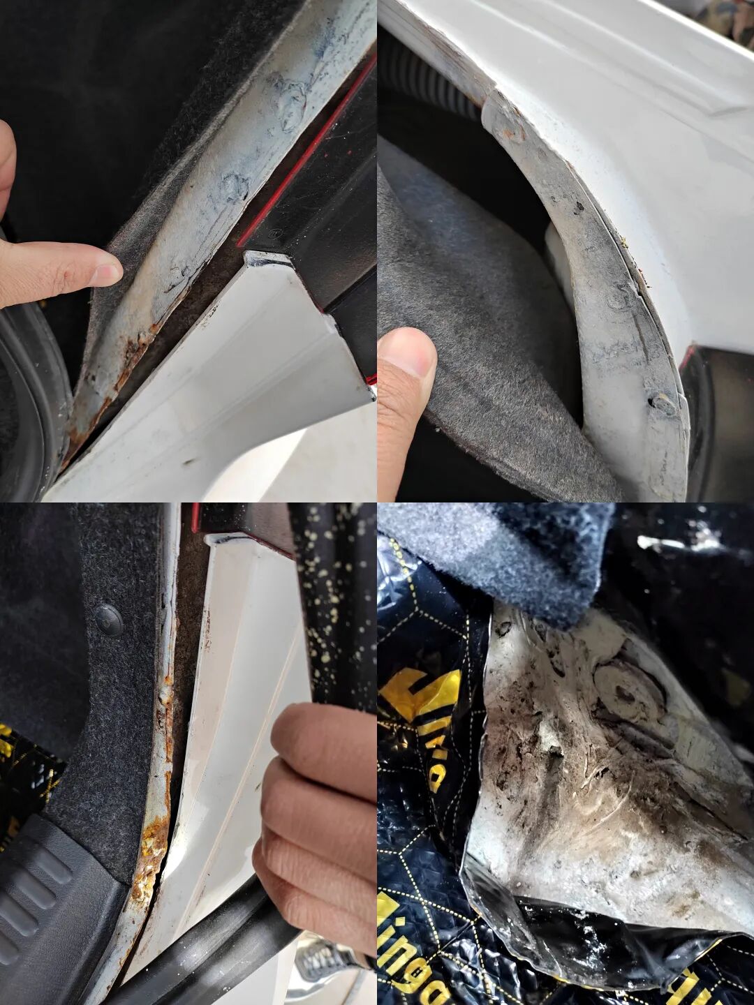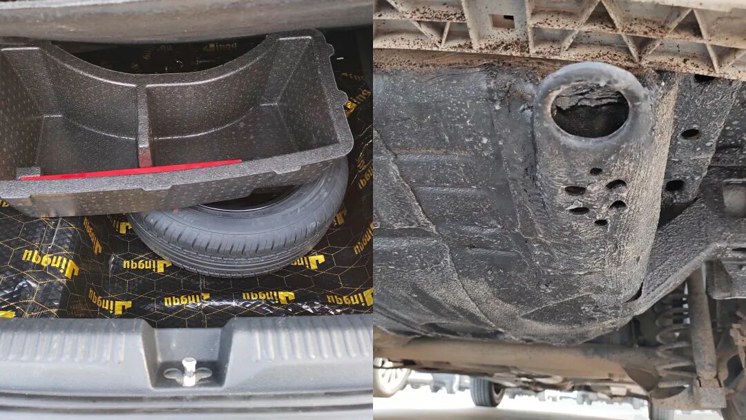 检测发现车右后角碰撞厉害,卖家在后备箱贴了胶,底盘后面喷的黑漆进行覆盖掩饰。