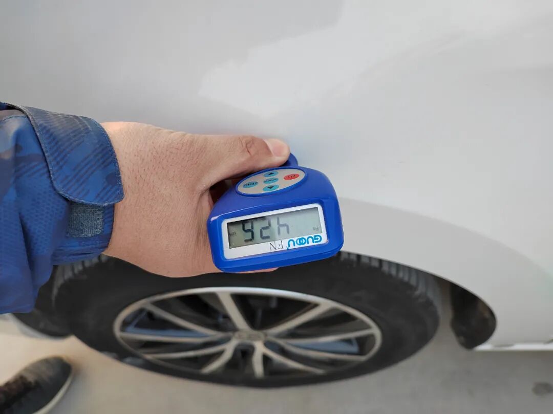 首先通过经验并辅助用漆面测厚仪检测一圈漆面情况,除了肉眼可见的局部划痕剐蹭,还发现外观覆盖件除了车顶和引擎盖全部有钣金现象,左前叶子板更换,右前叶子板更换再修复。另外,四条轮胎都进行了更换。