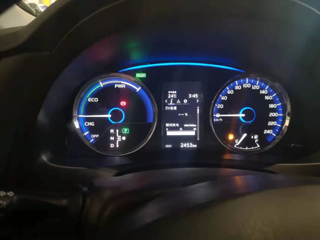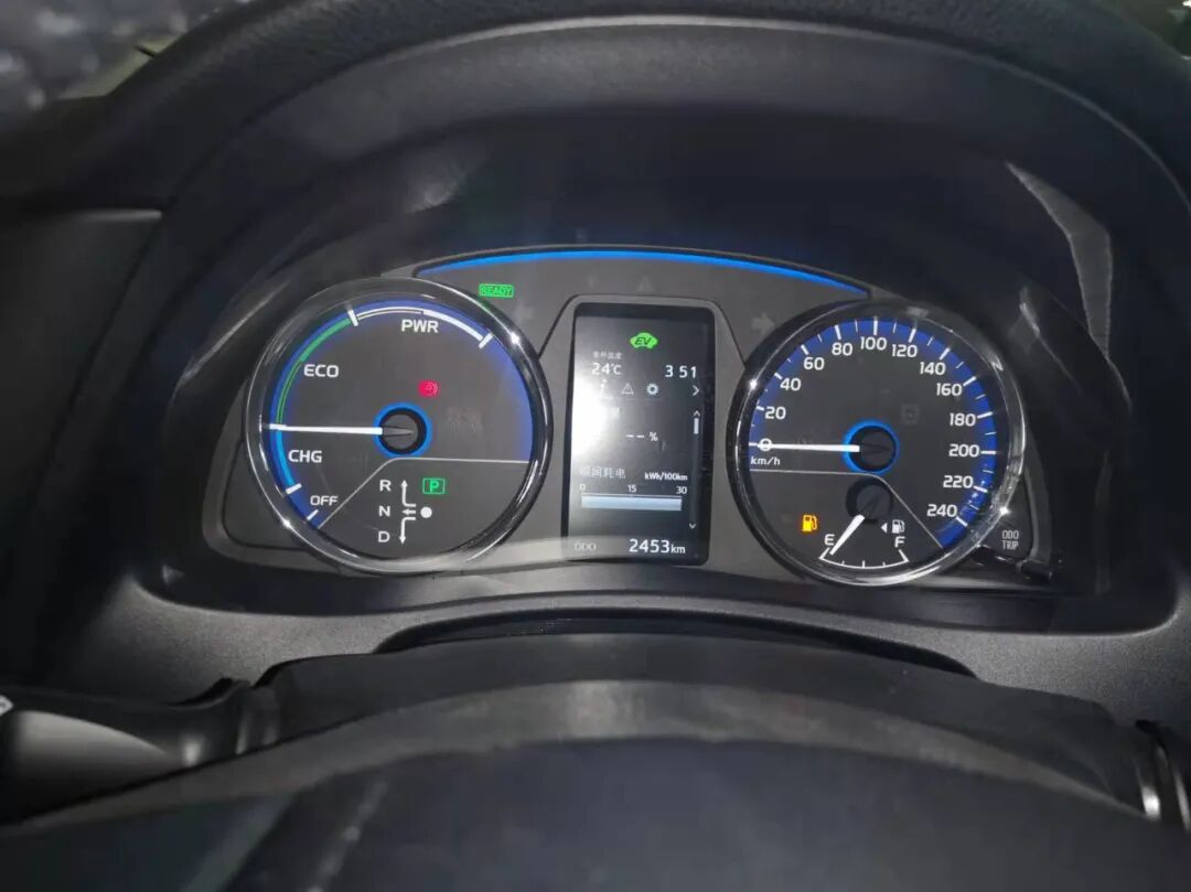 和其他新能源车型一样,雷凌双擎E+的纯电模式由于不需要发动机介入,因此按下一键启动后,不会感觉到发动机点火的震颤和声音。不过仪表盘上会有READY的绿灯,告知驾驶者一切就绪。