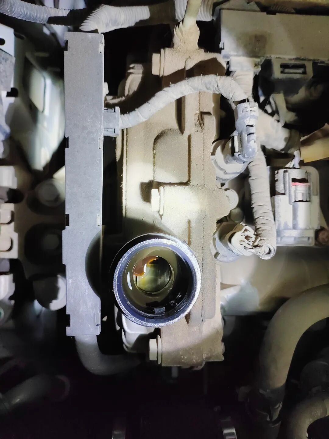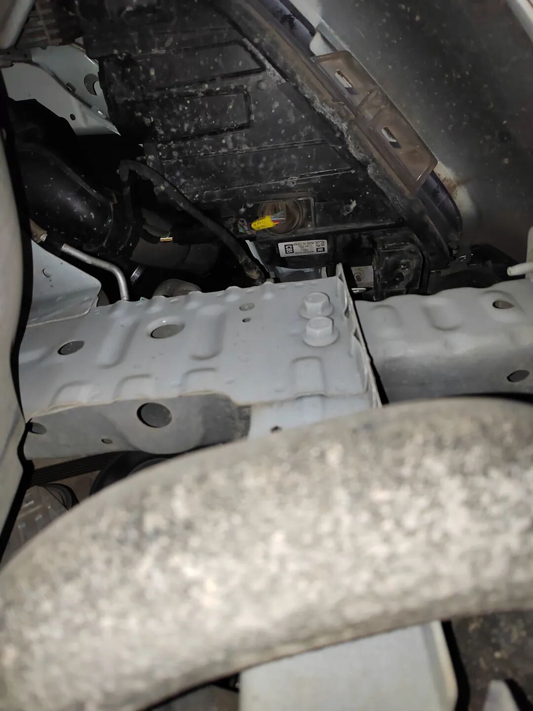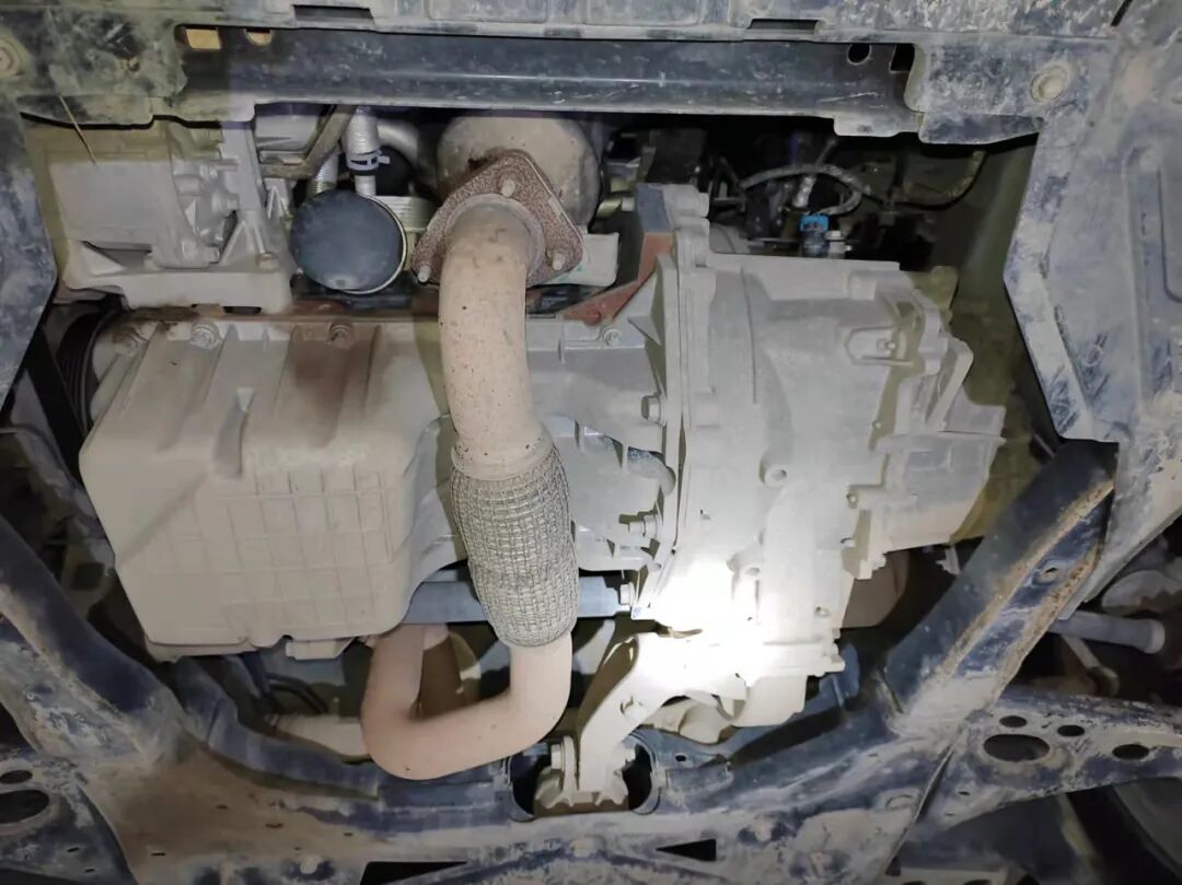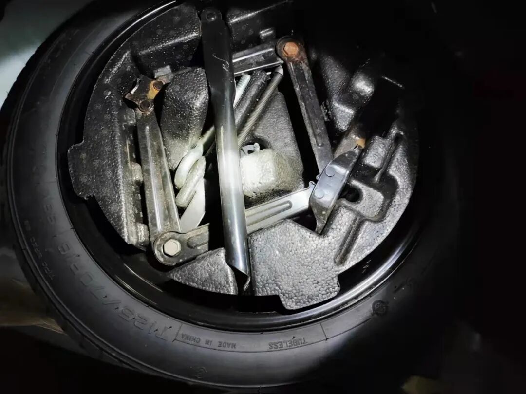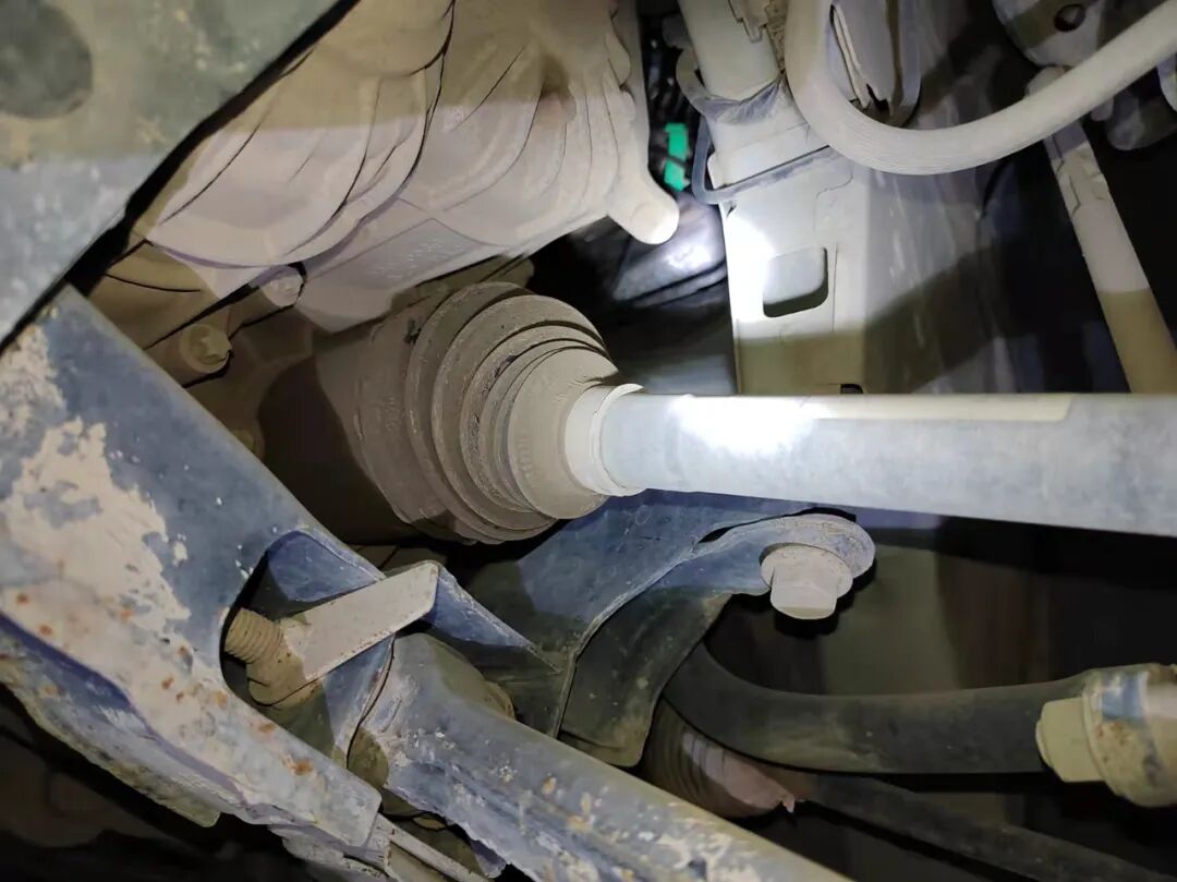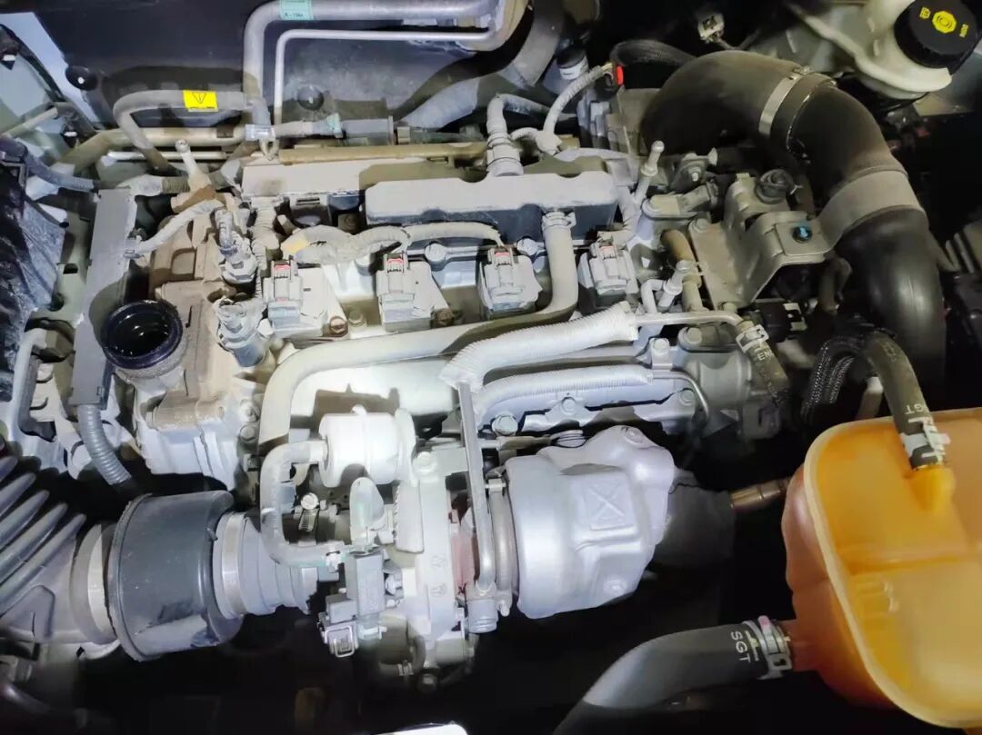 打开机舱盖,胡大大拿着手电大致看了下,发现发动机有轻微油迹。仔细检查后,发现发动机和变速箱都没有修复的痕迹,原厂胶都在,油液正常,纵梁、防火墙、减震器、ABC柱都没有修复痕迹,叶子板内骨架、大灯、水箱框架等都正常。