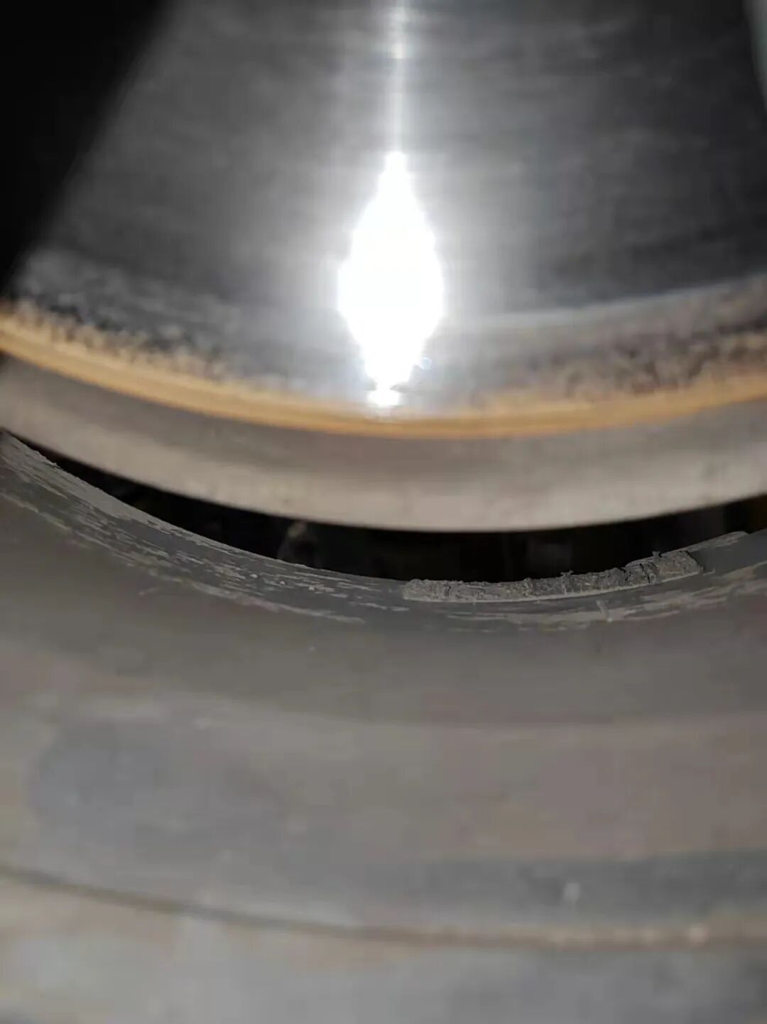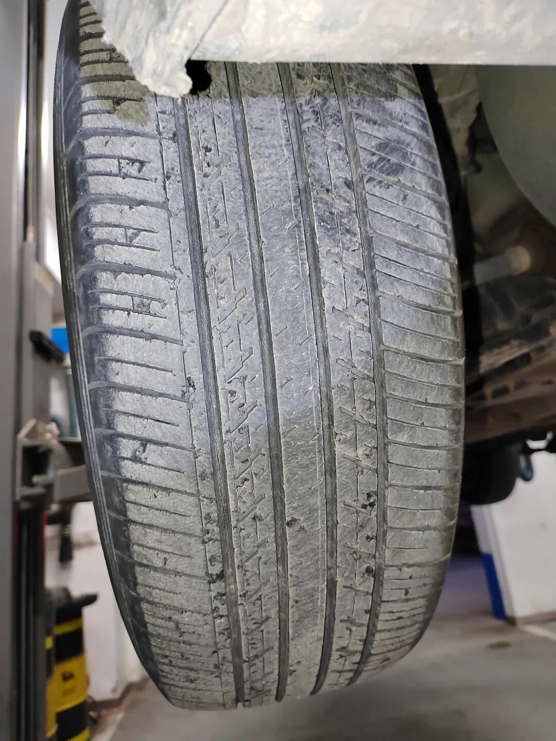 检查轮胎,发现轮胎有剐蹭,而且轮胎胎面磨损比较很。