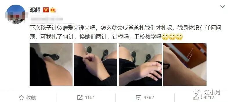 邓超无奈,只好做个示范,他被扎了14针,女儿才同意扎了两针。