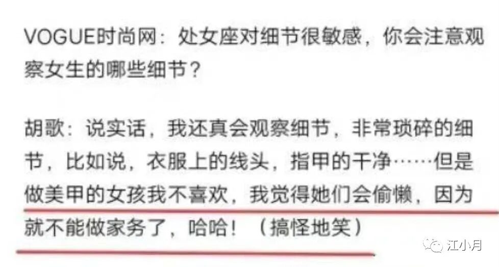 胡歌很清醒,他甚至说过,自己不希望将来的妻子做美甲,因为做美甲的女人根本就没办法做家务。