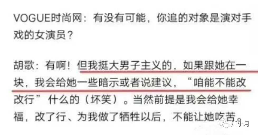 之前,胡歌曾经透露,自己应该不会考虑和圈内的女明星结婚,因为自己有点大男子主义,圈中的女星们一个比一个强势,性格根本就和自己不合。