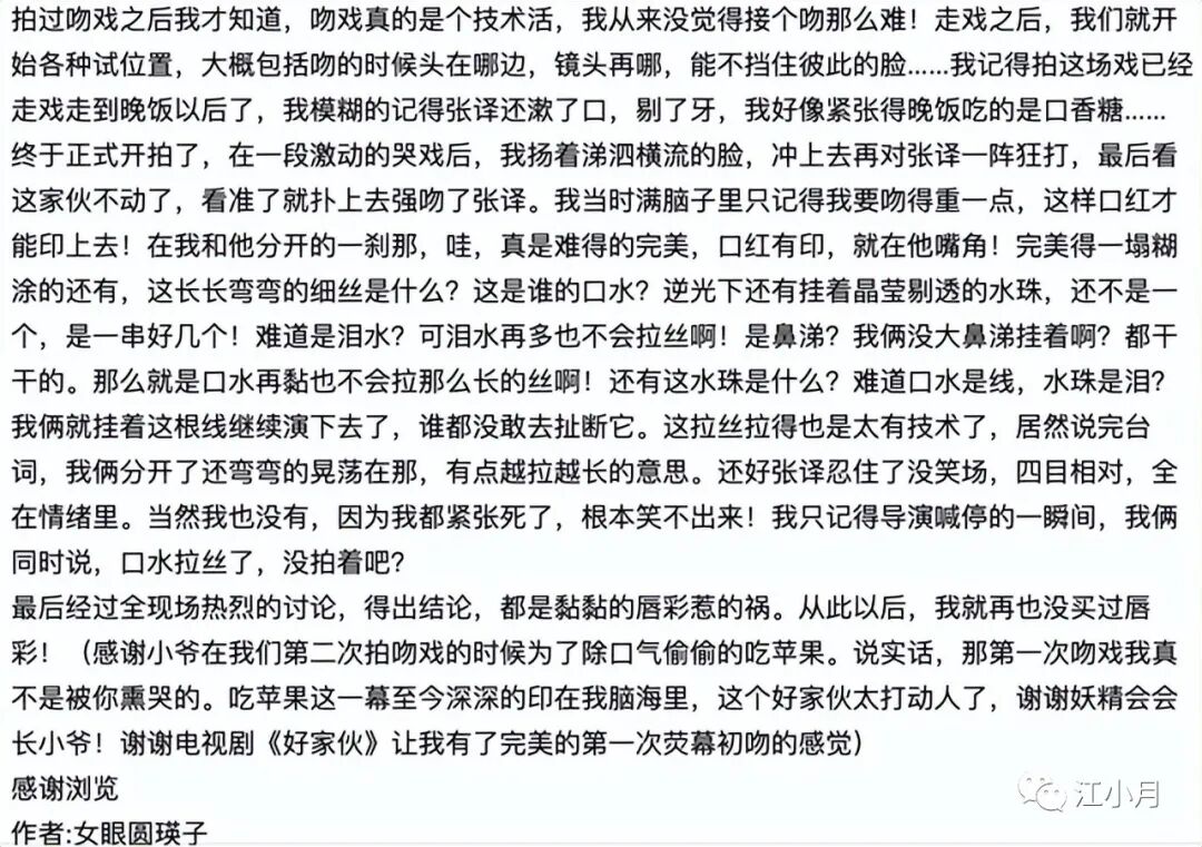 他和瑛子拍《好家伙》的时候,张译说拍完吻戏的镜头,两个人嘴之间还出现了一条一米多长的口水线,哎哟我去,这,我无语了。