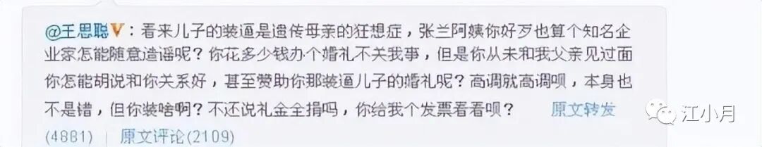 从此,王思聪和汪小菲母子就“婚礼到底是谁赞助的”开启了几年的骂战。