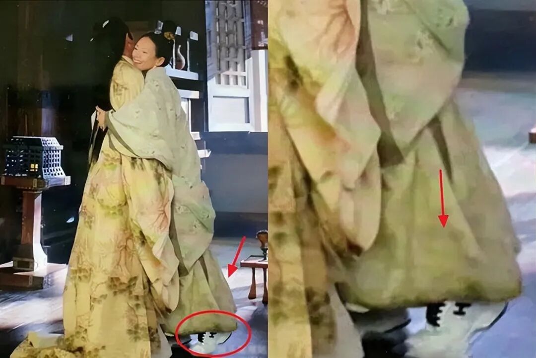 那时候的鞋子都被衣服盖住了大部分,但妹妹,咱再高兴,也不能忘乎所以啊,你运动鞋都露出来了。