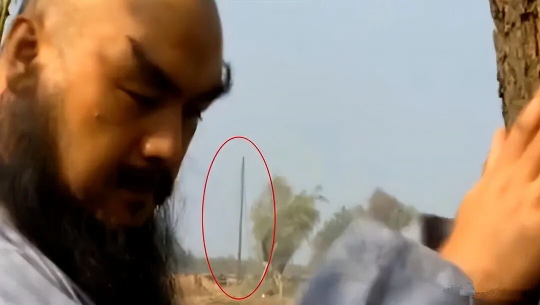 倒拔垂杨柳这段戏,鲁智深的后面竟然出现了一根电线杆,摄影师看来还是大意了,没注意到远景。