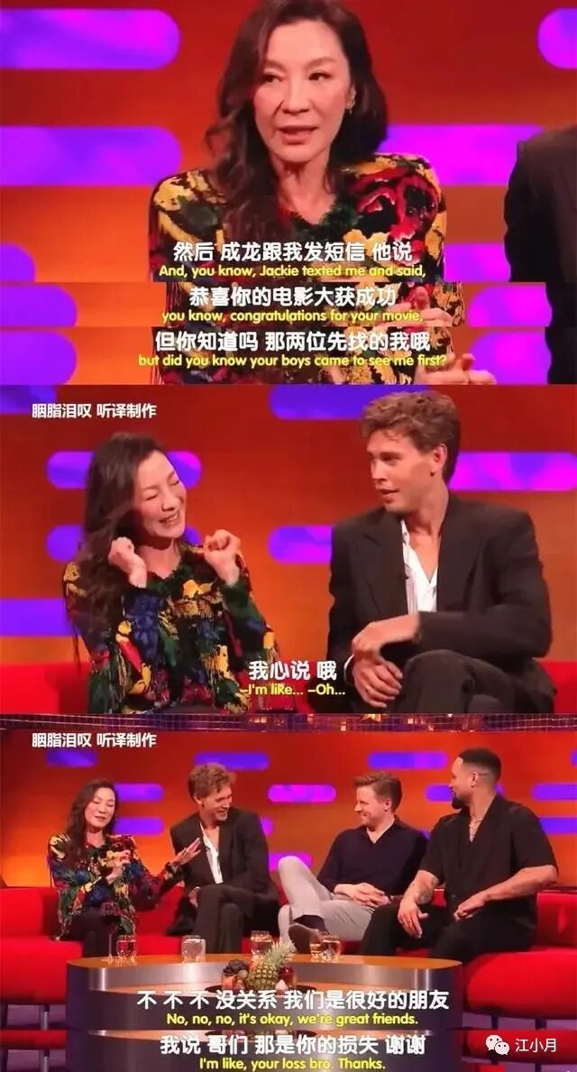 就连杨紫琼84对的老母亲得知这个消息,都喜极而泣,平时很沉默的周星驰,吴彦祖,甄子丹向她表示祝贺。