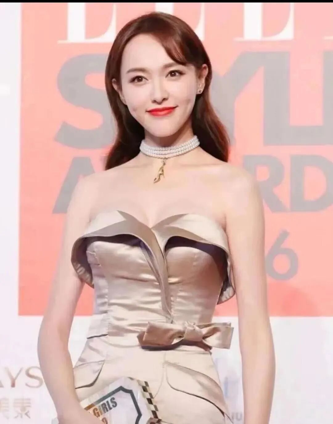 为了更好的搭配裙子,设计师给唐嫣搭配了一条珍珠项链,这条珍珠项链缠绕了三层,在灯光下金光闪闪,特别吸睛。